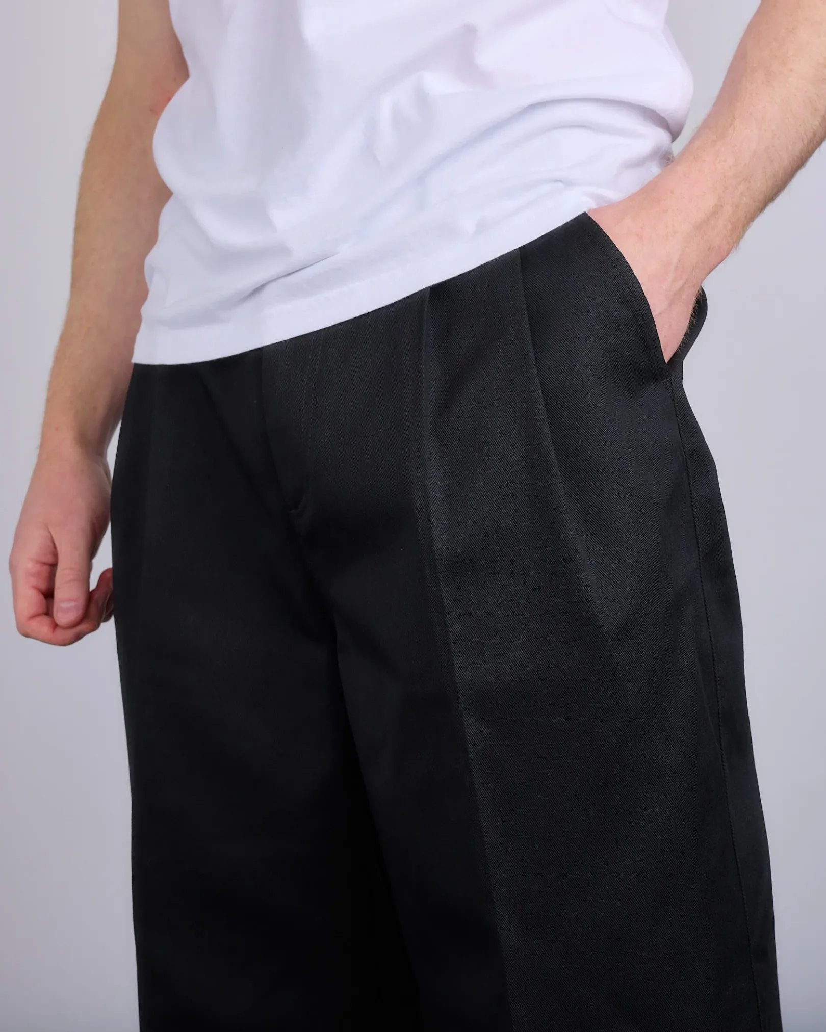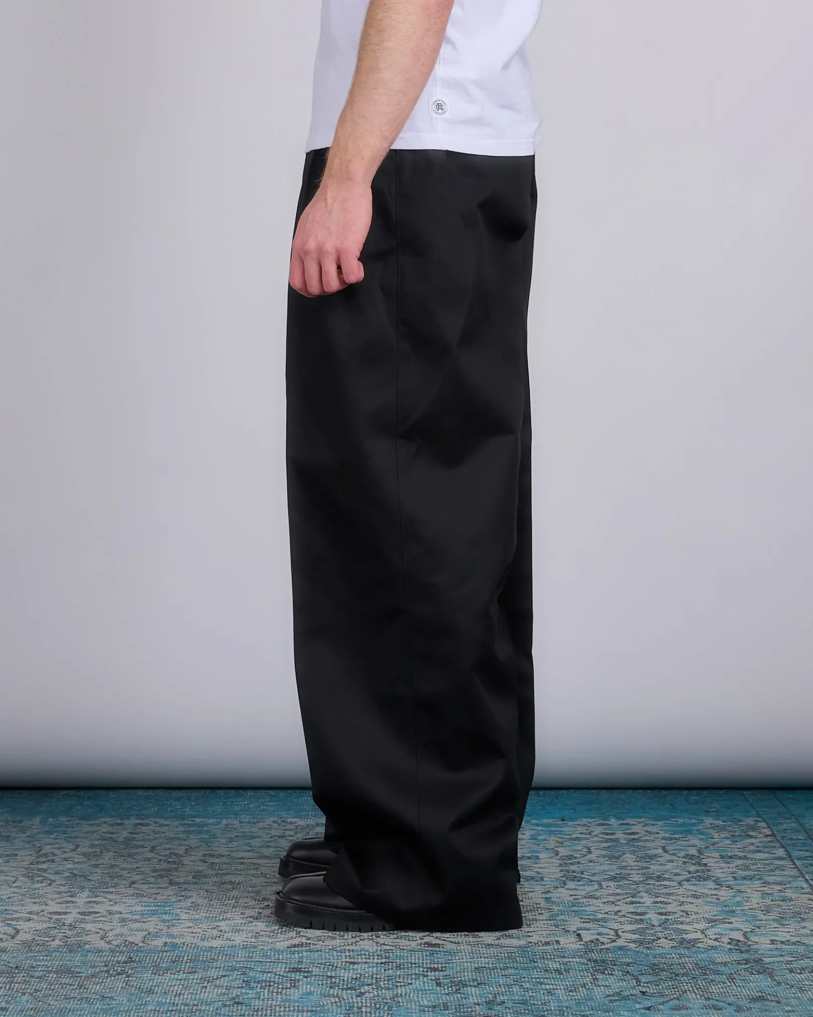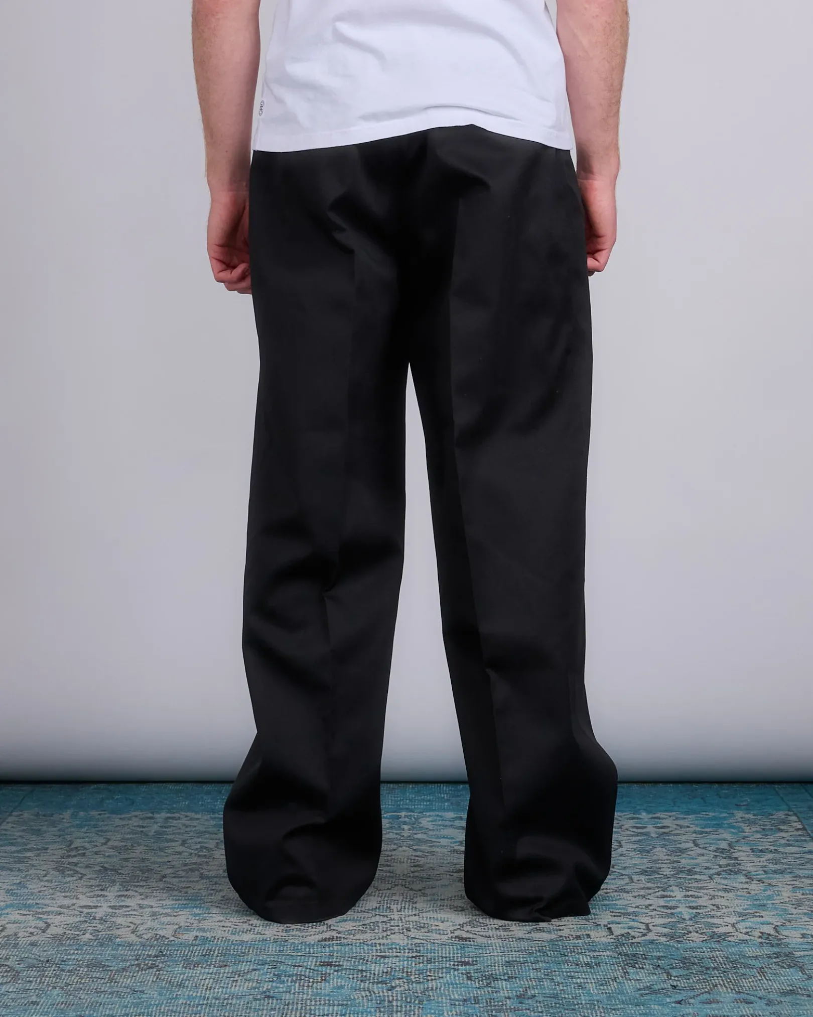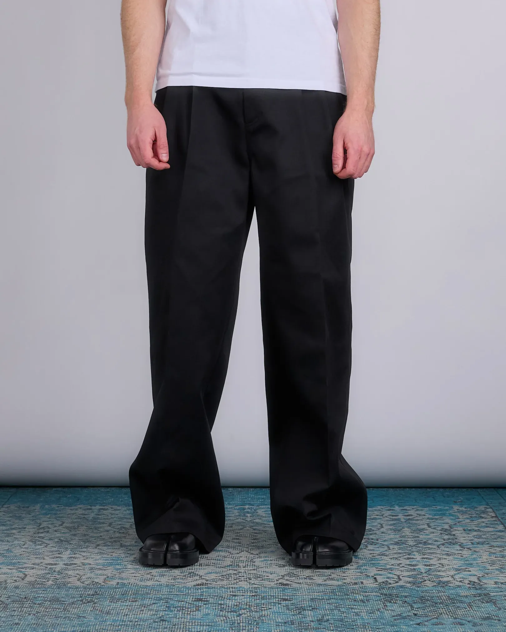 With a high-waist and pleats, the wide skater chino trousers feature the Margiela hook. The back is elasticated, with side and back pockets. Maison Margiela’s signature, the Four stitches, appear at the back; the opposite of a label.