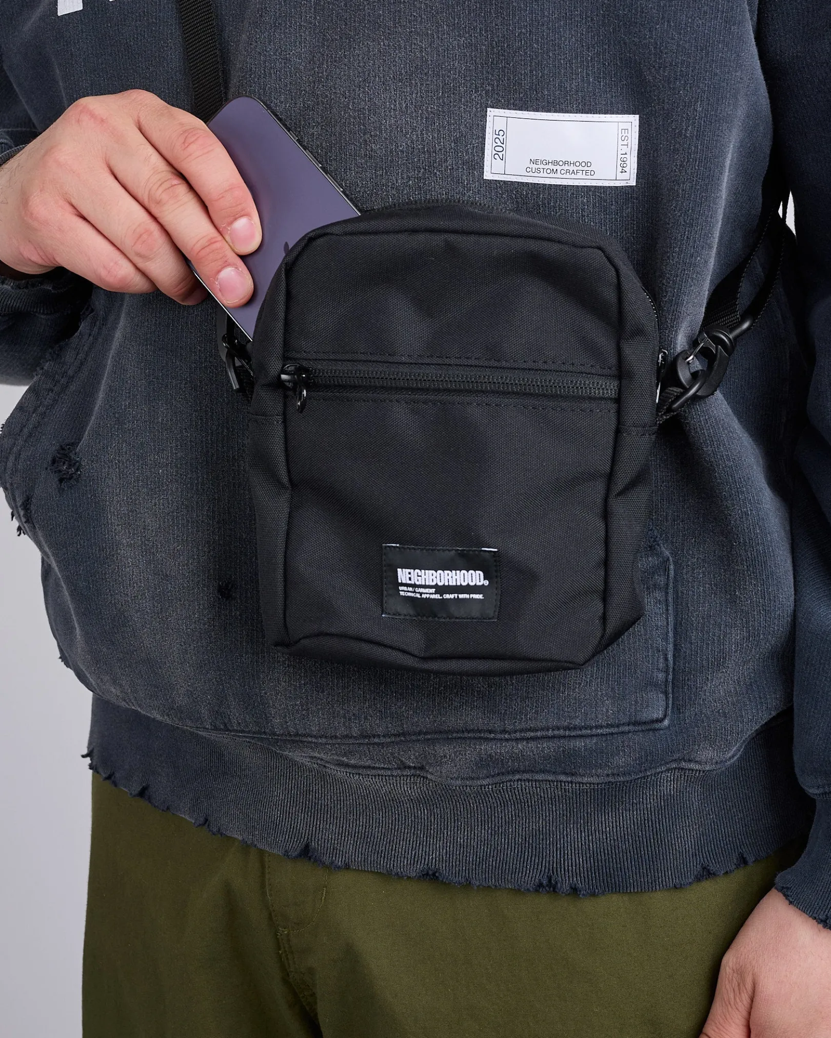 A compact, eco-conscious shoulder bag crafted from recycled polyester, made by decomposing and re-polymerizing fabric waste to match the quality of petroleum-based fibers. Features include a zippered front pocket, inner compartment, and detachable shoulder strap. Finished with a branded name tag and ideal for carrying essentials like your phone and wallet.