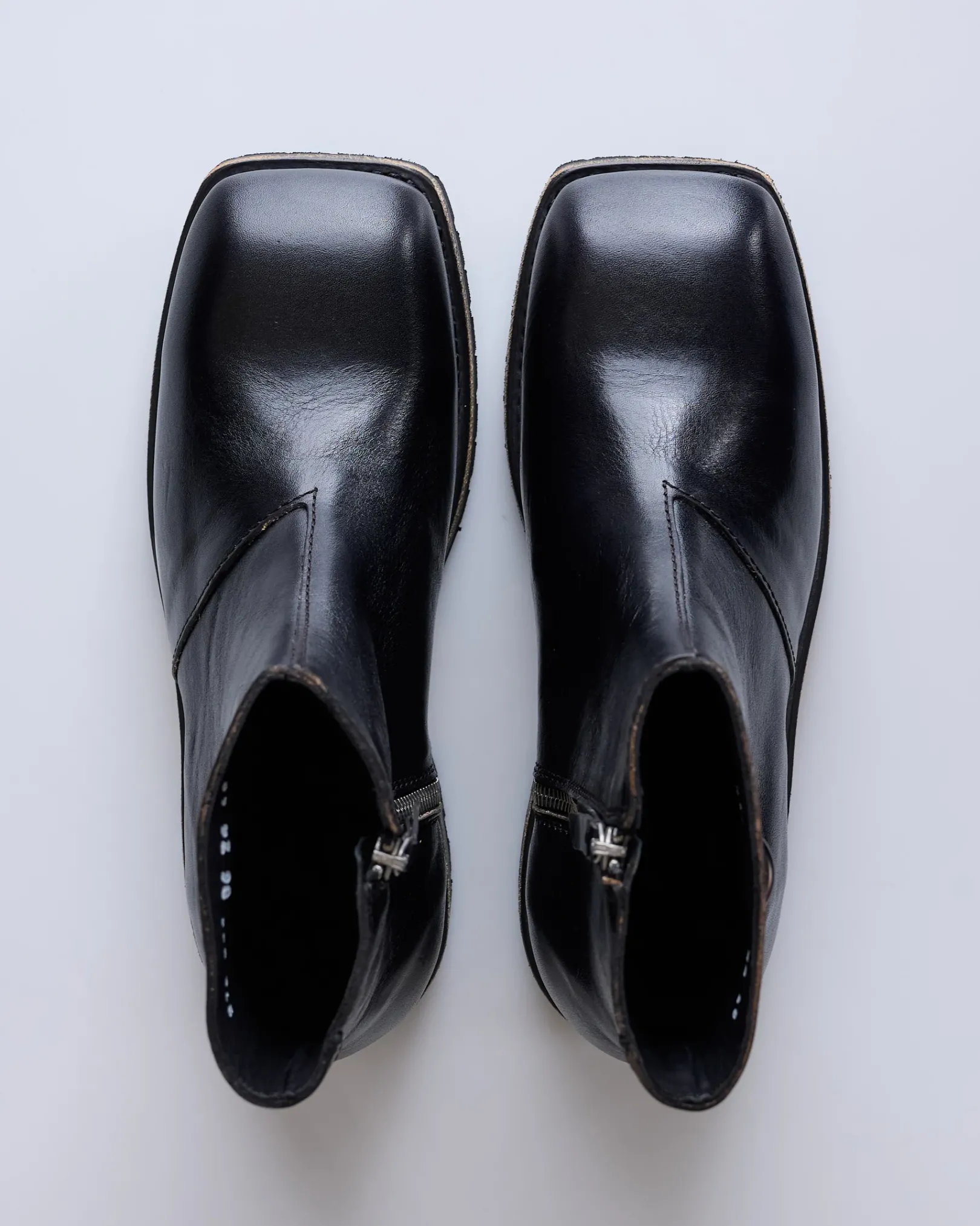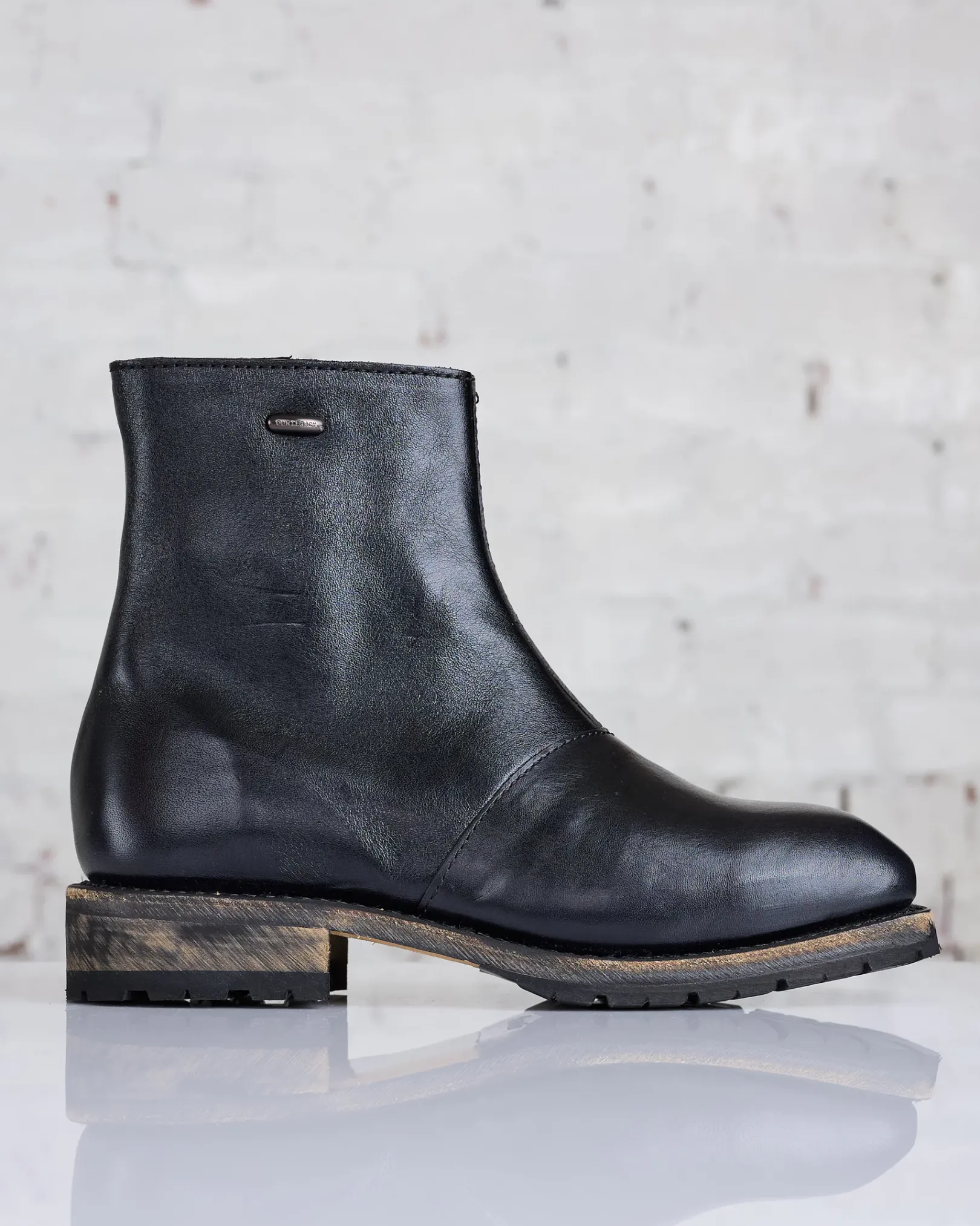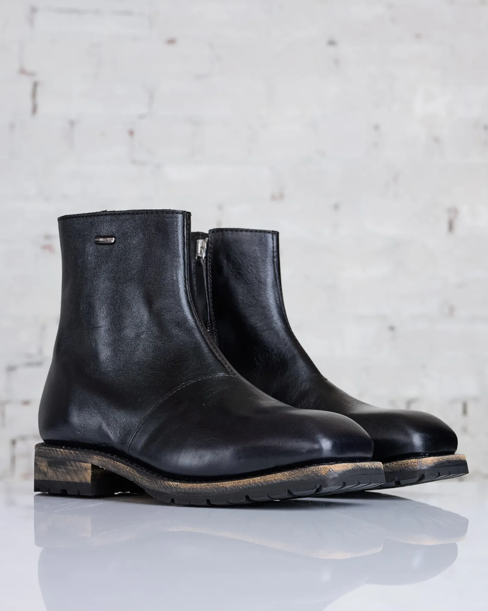 Engine Boot in Deep Black Leather. Produced in an Italian leather, the mid cut Engine Boot features a lugged Vibram sole, a Lampo side zip and a metal Our Legacy rivet.