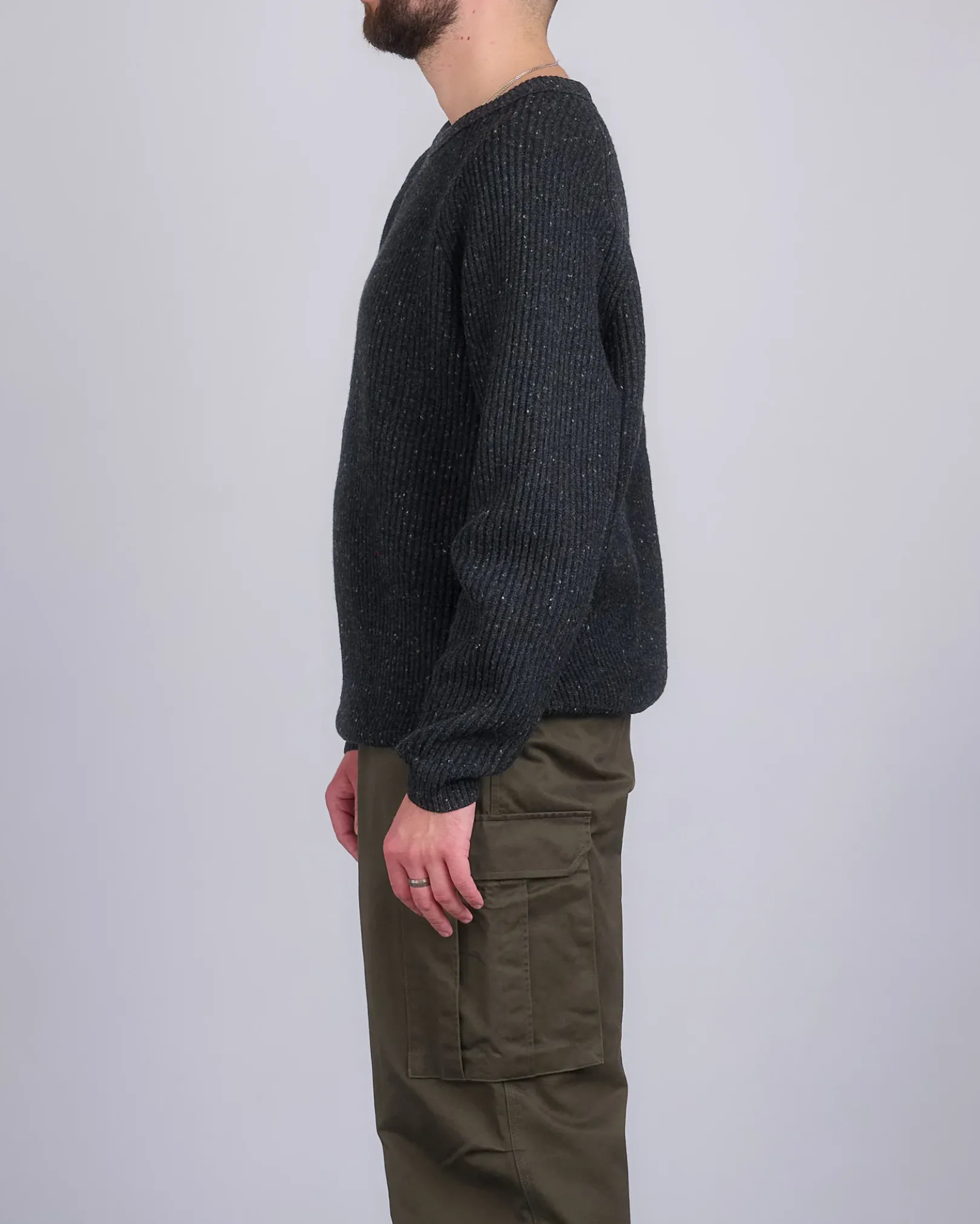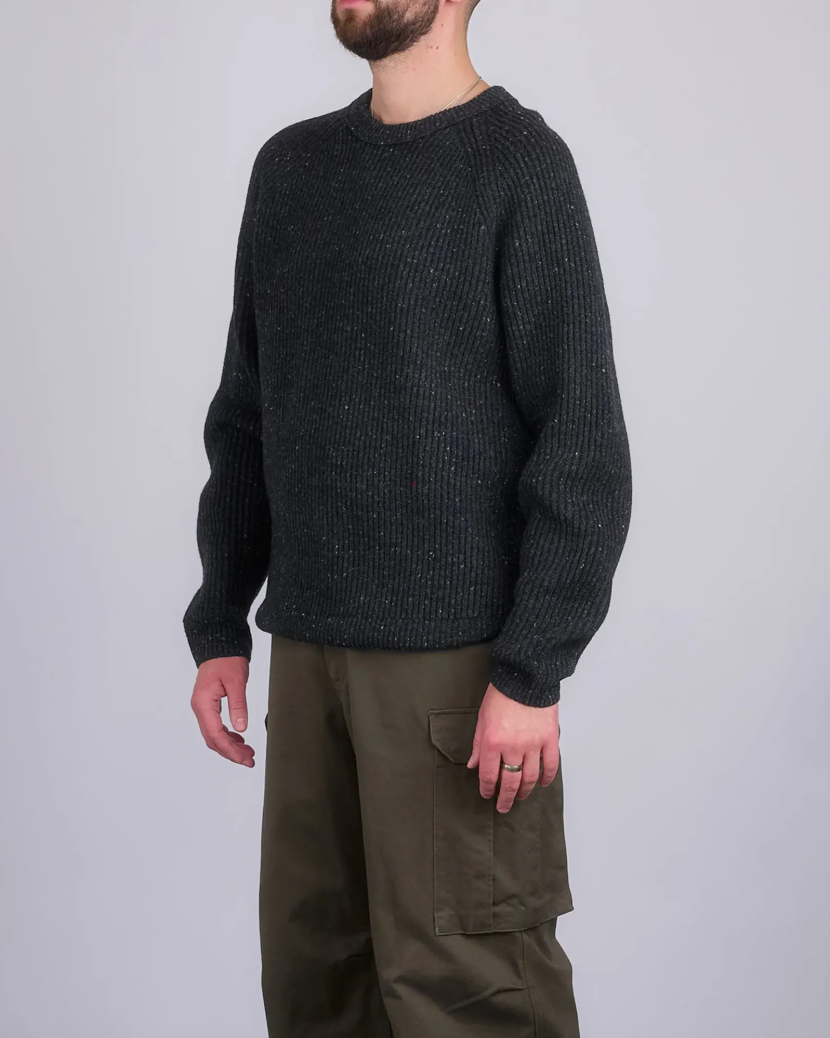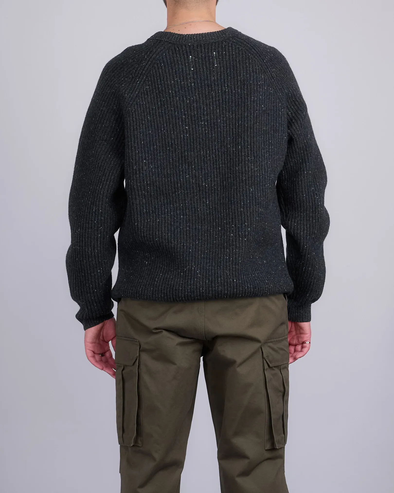This knitted crewneck is crafted from nep merino wool, featuring small knots or clusters to impart distinctive character and feel. Constructed in a standard fit, with fully fashioned seams. Designed with a rib knit collar, raglan sleeves, side gussets, and rib knit cuffs and hem.
