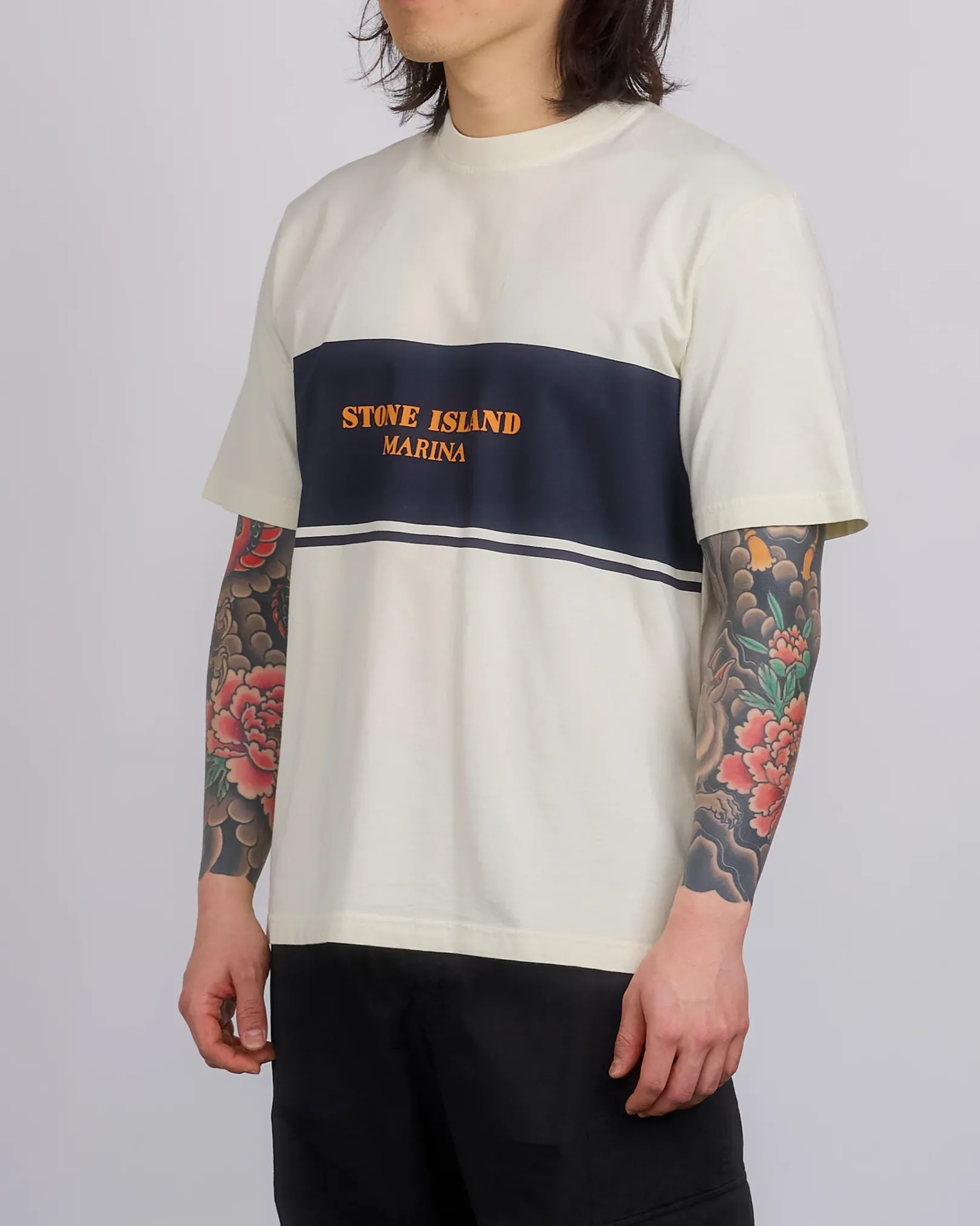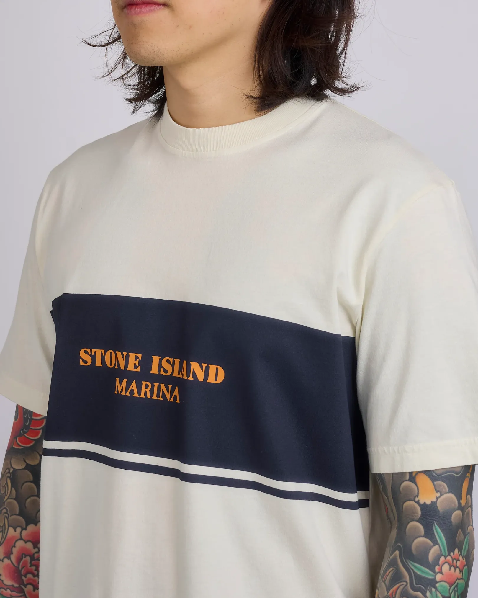 Ribbed neckline. Solid band print on front featuring Stone Island Marina lettering in contrasting color. Oversized fit.