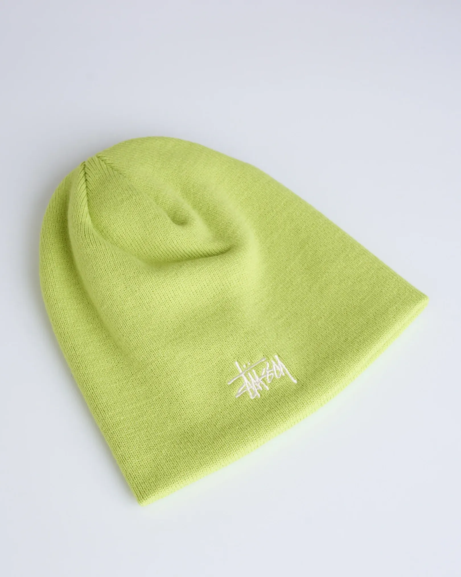 Fitted skullcap beanie in a fine guage knit. Stüssy basic stock logo embroidery at the front.