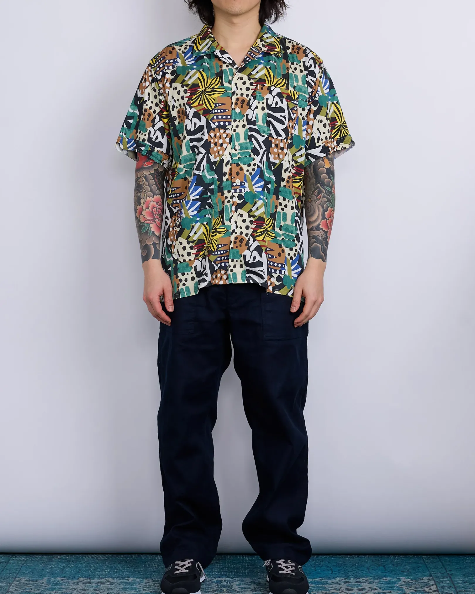 The Camp shirt silhouette features a short sleeve button up front, two patch pockets: one at the chest and the other at the waist. Details include a straight hem and split side vents.