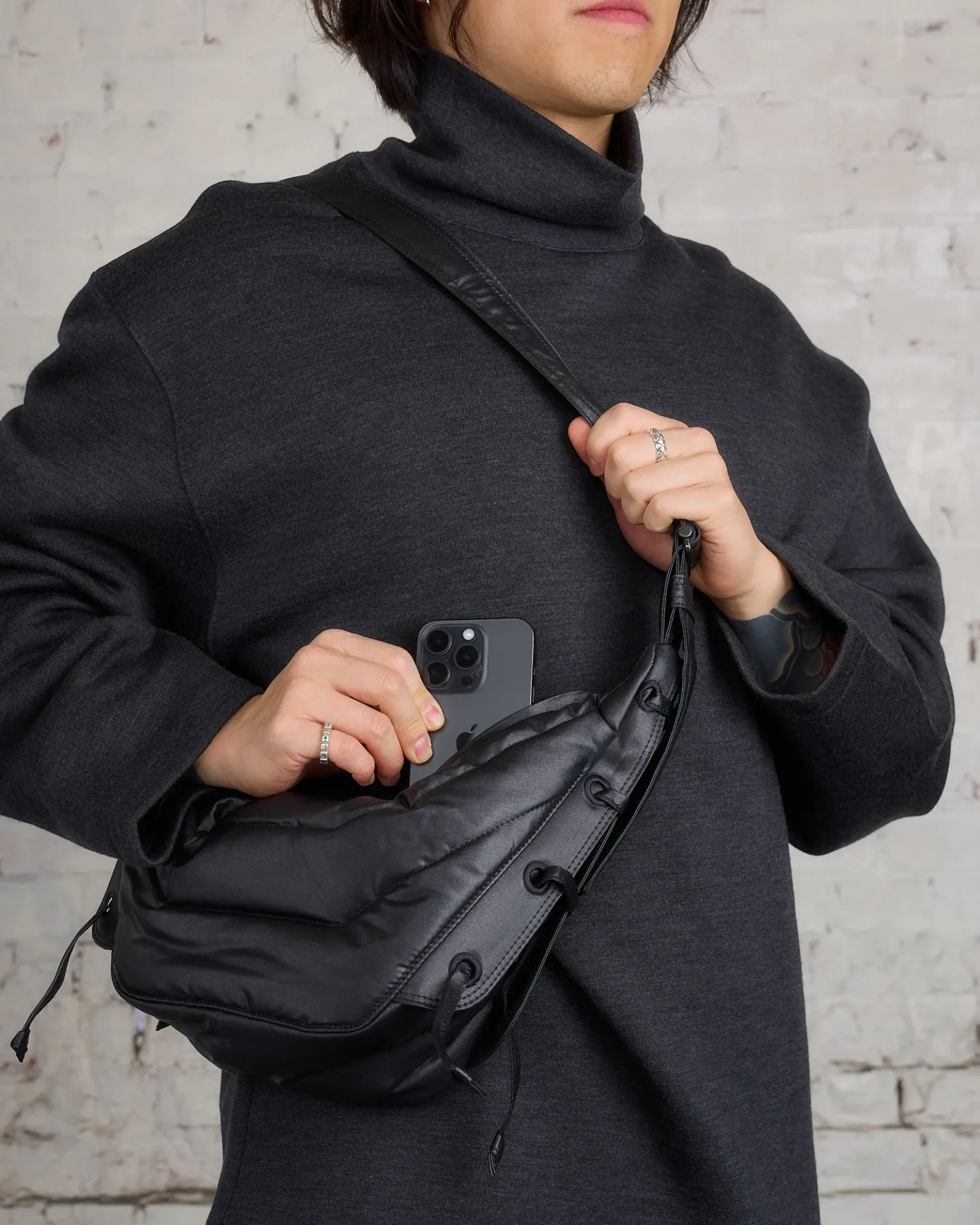 The Soft Game line is reinvented in a new fabric this season. This Small Soft Game bag is made of a fluffy-cotton canvas treated with an icy, water-repellent finish – OCS certified. Its wadded fabric gives the bag a shiny surface and a sturdy structure that holds its shape over time. Inspired by the Croissant bag, the Small Soft Game is lightweight yet functional thanks to its padded adjustable strap and its interior zipped pocket. It has the capacity for accessories such as a smartphone or a 4×7-inch book. On both sides of the bag, embroidered eyelets and laces allow its volume to be adapted. Ideal for daily use, this style can be worn as a shoulder or a cross-body bag.