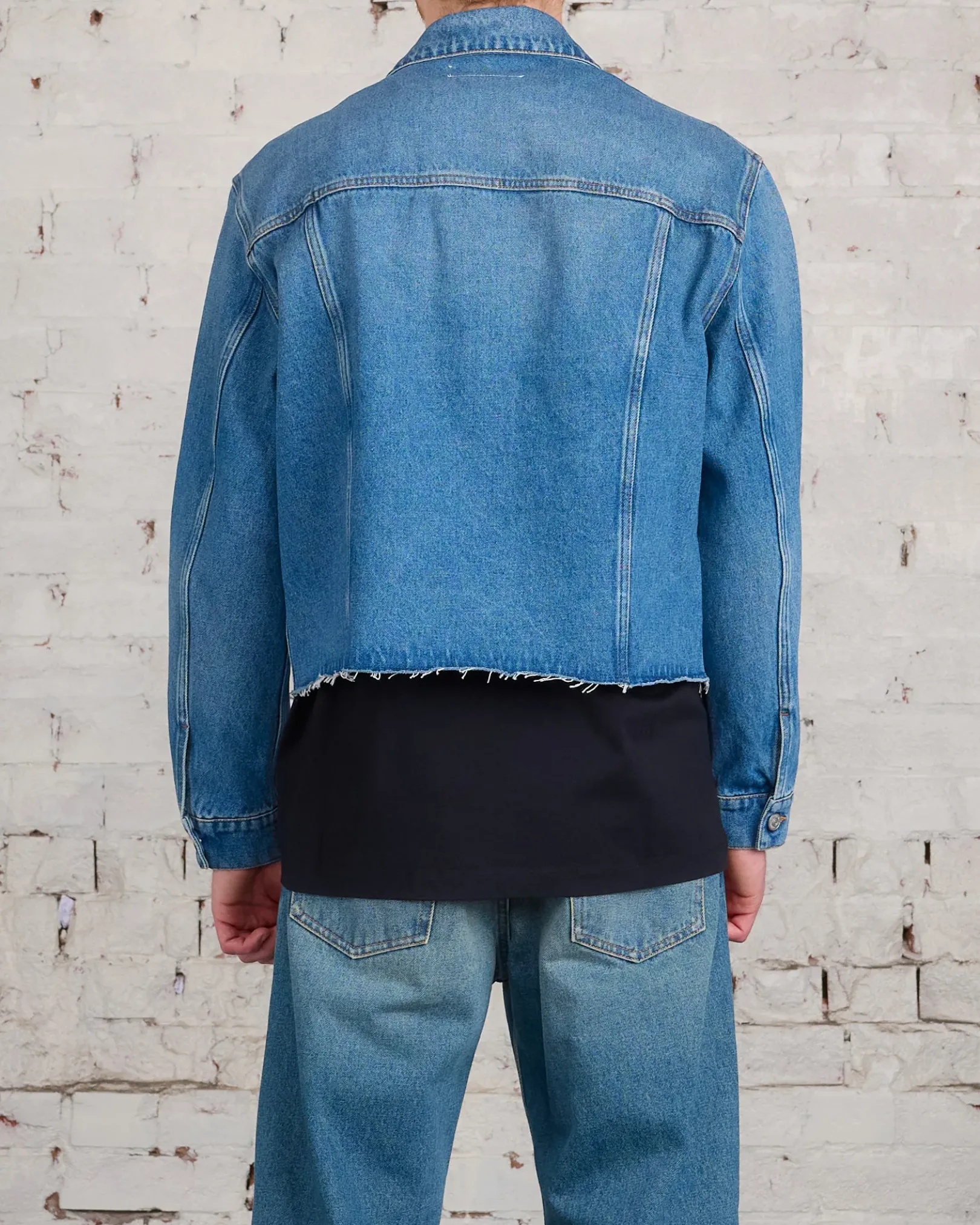 MM6 has crafted this blue-rinsed denim jacket with long sleeves and a raw-edge hem. The style also features button closure and buttoned flap pockets and cuffs. The brand’s discreet yet distinct signature, a horizontal line of white stitches, is also found on the back of the garment.