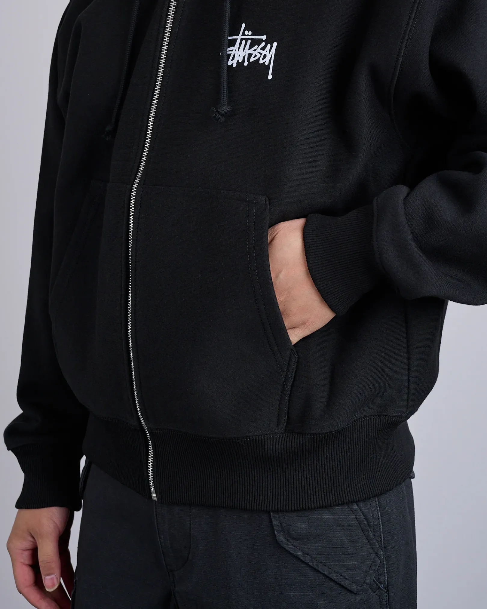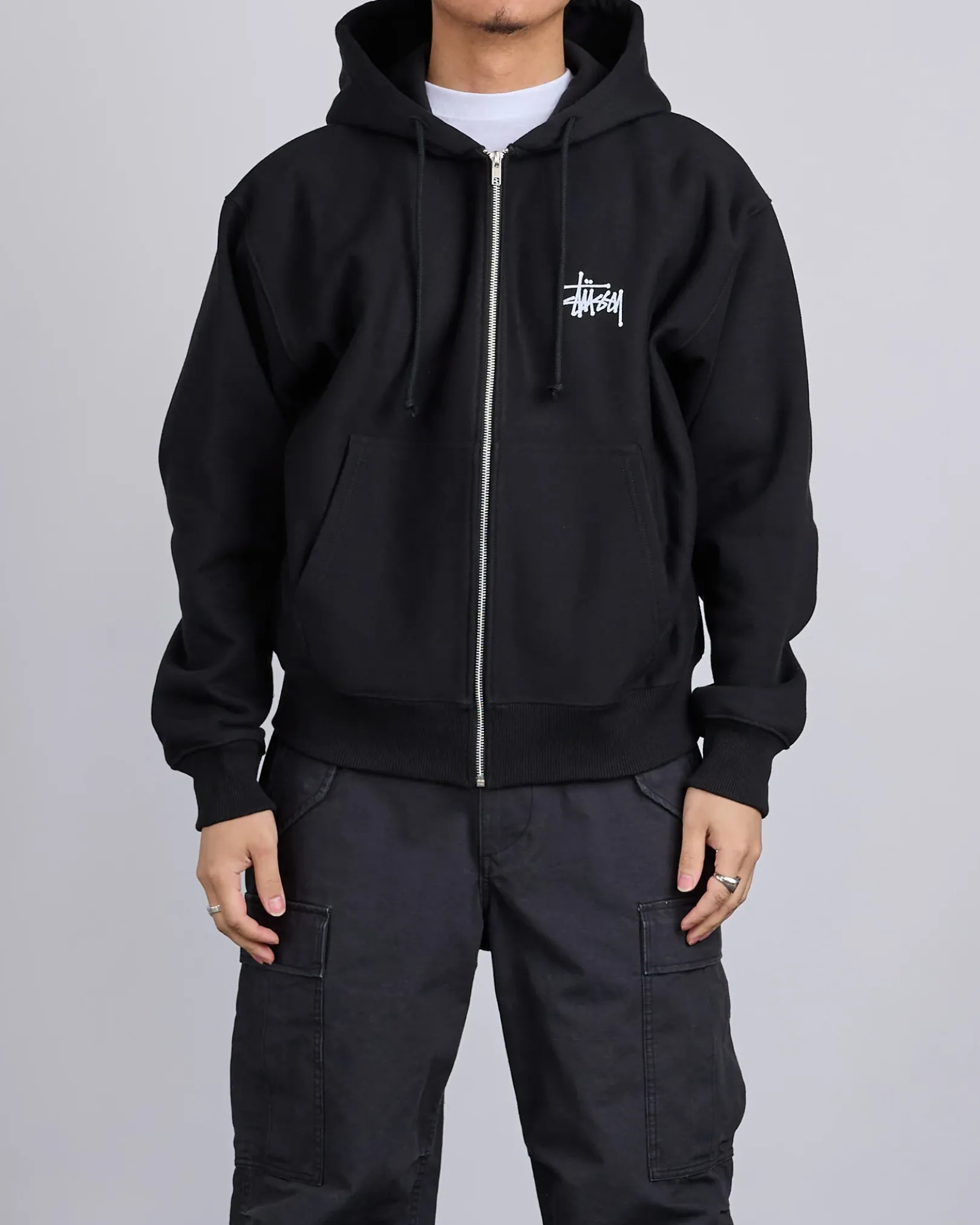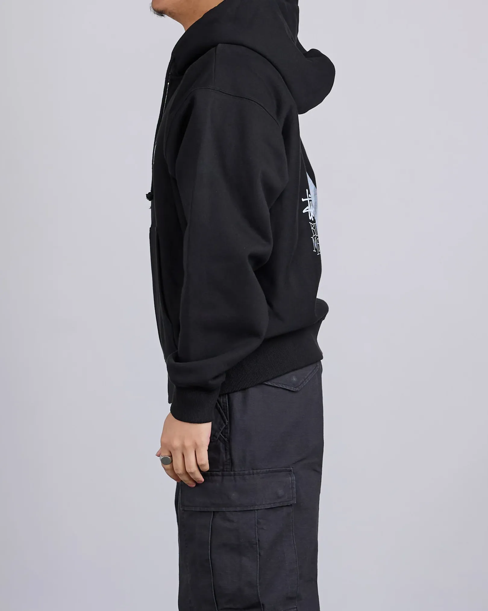 Relaxed fit zip-front fleece hoodie in a heavyweight 430gsm cotton blend. Screenprinted graphics at left chest and across back.