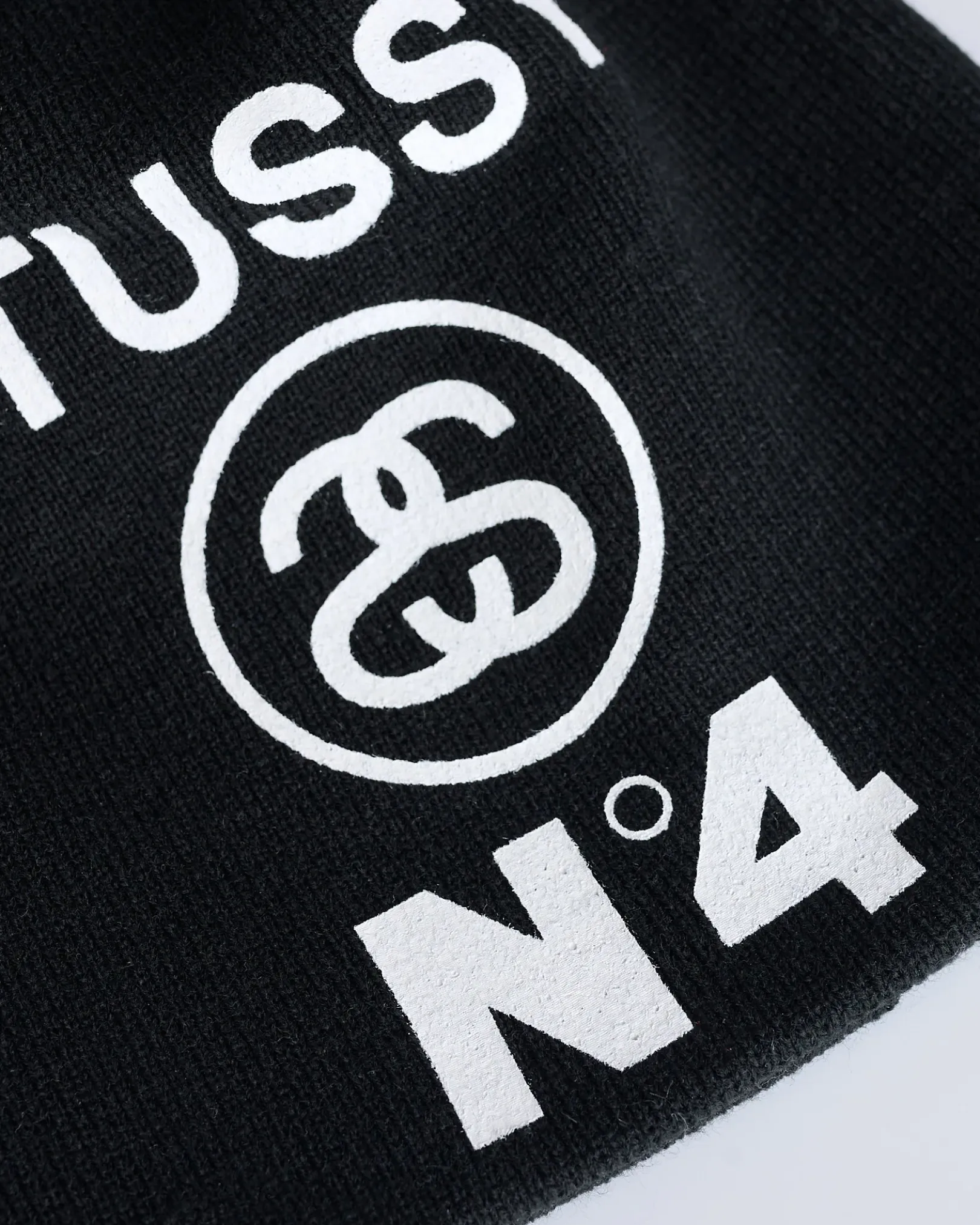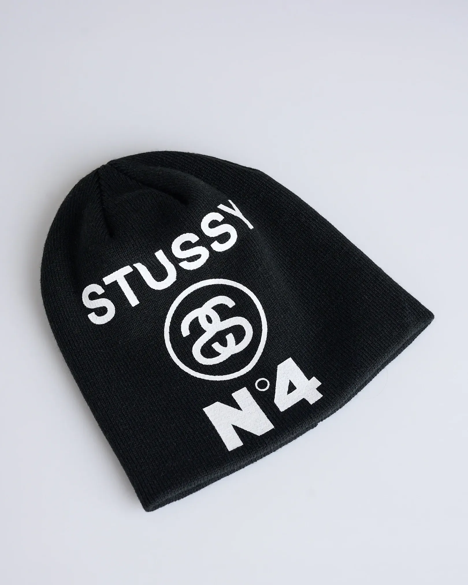 Fitted skullcap beanie in fine guage knit. Screenprinted with Stüssy number 4 artwork.