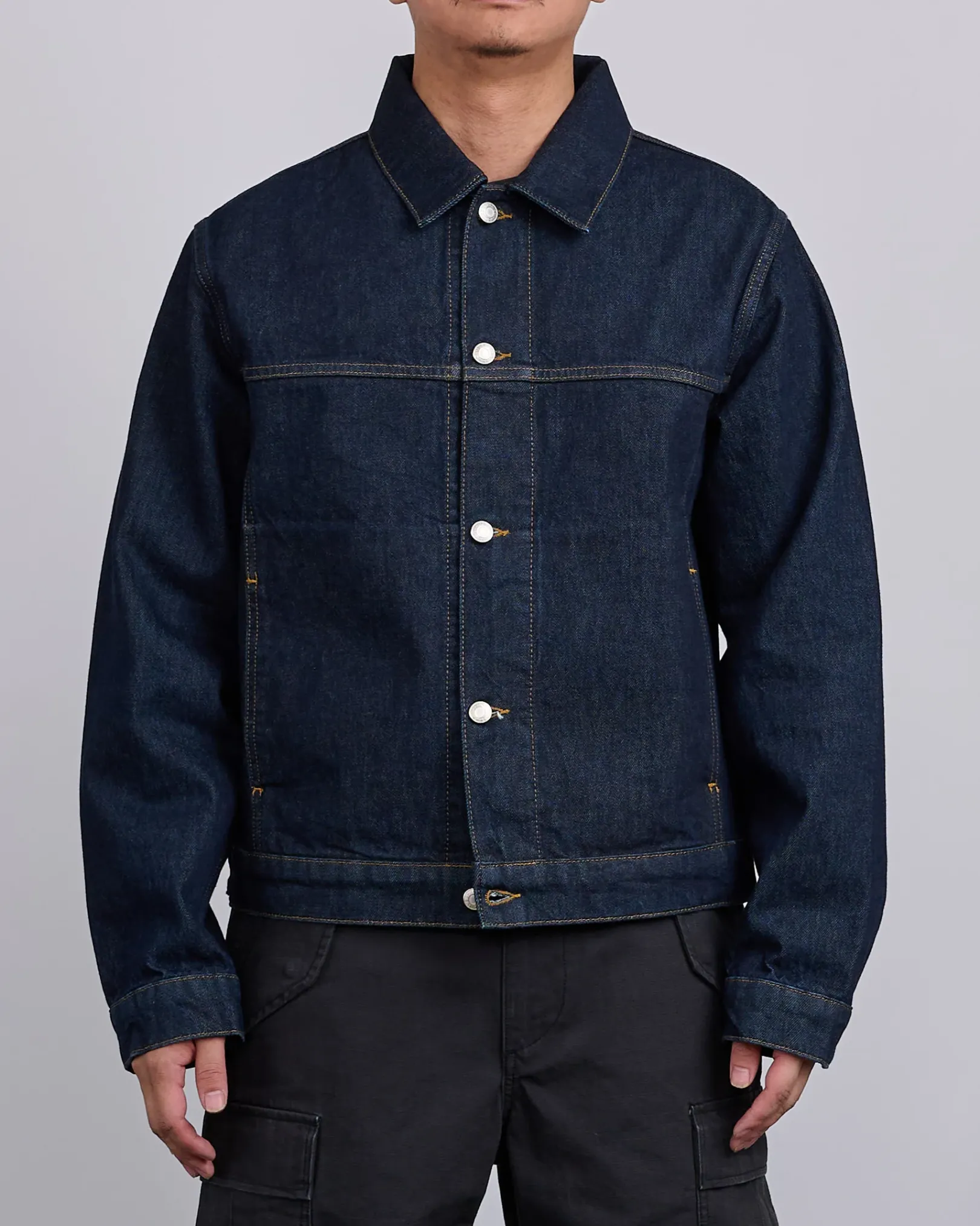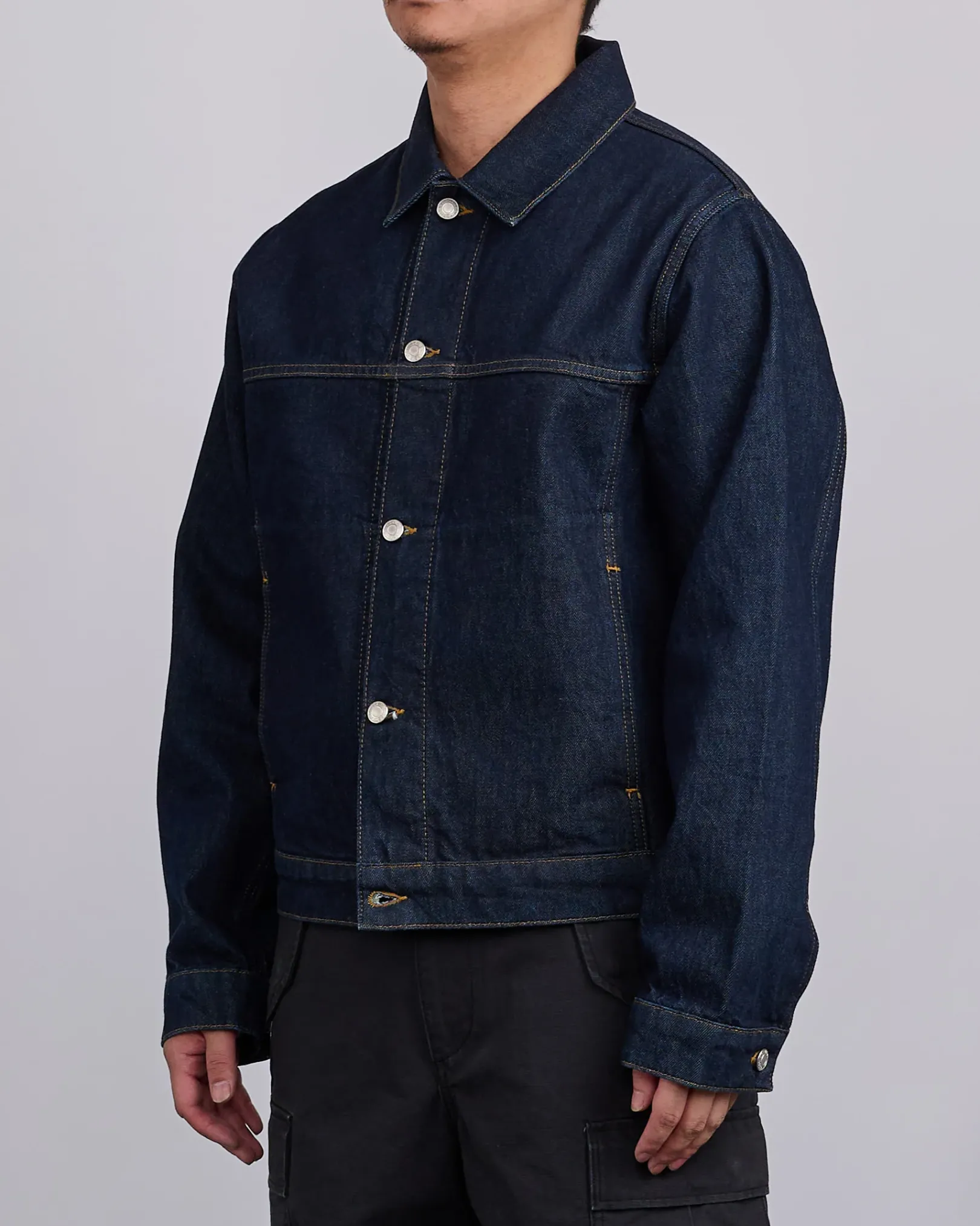 Relaxed fit trucker jacket in 14.5oz rinsed indigo denim. Boxy cut with branded nickel shank hardware, gold topstitching and a suede Stüssy logo patch.