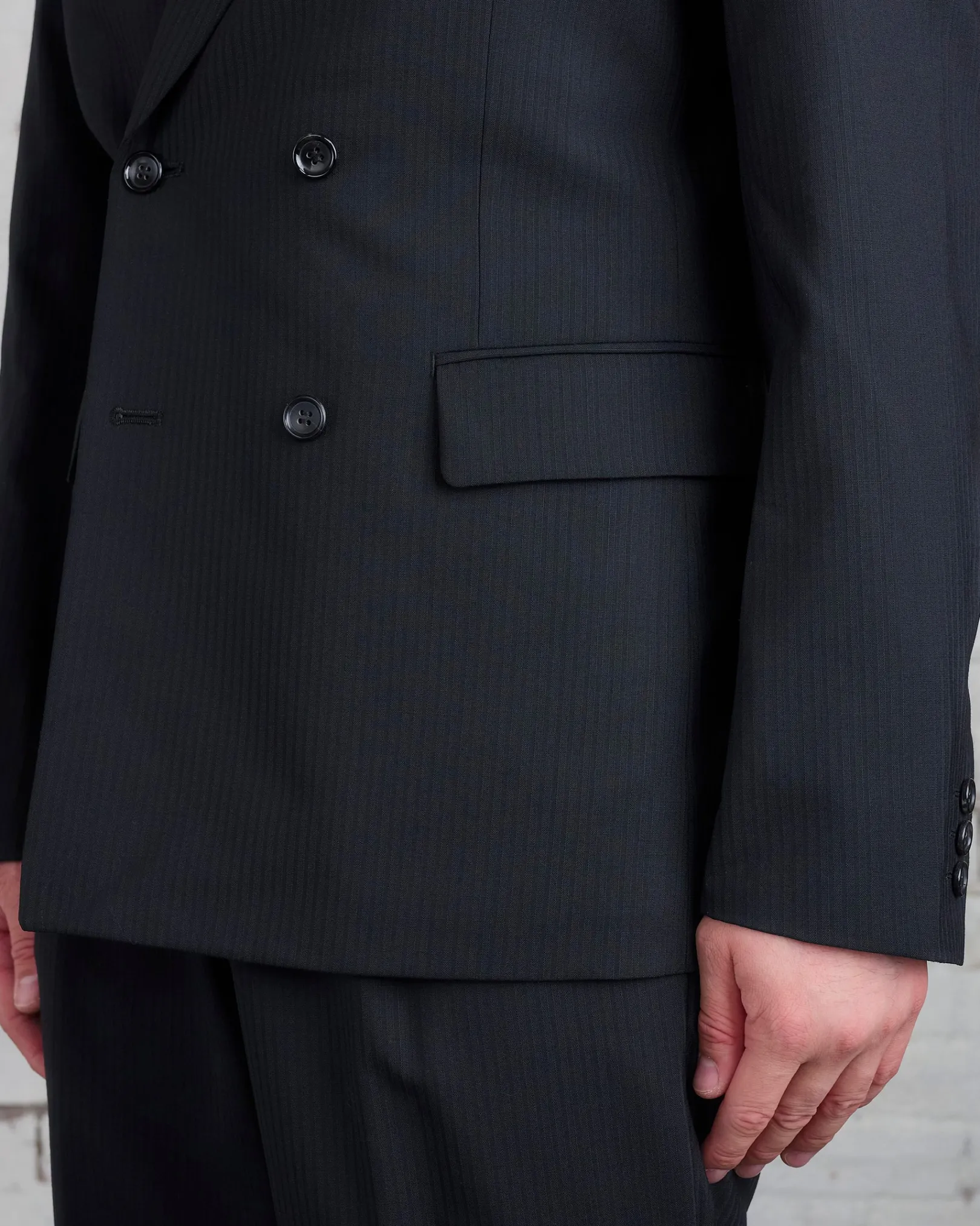 Made in Japan double breasted suit jacket. It features a detachable polyester satin collar, notched lapels, button closure, flap hand pockets, partially satin lined, and twin vents at the rear. Slim fit.