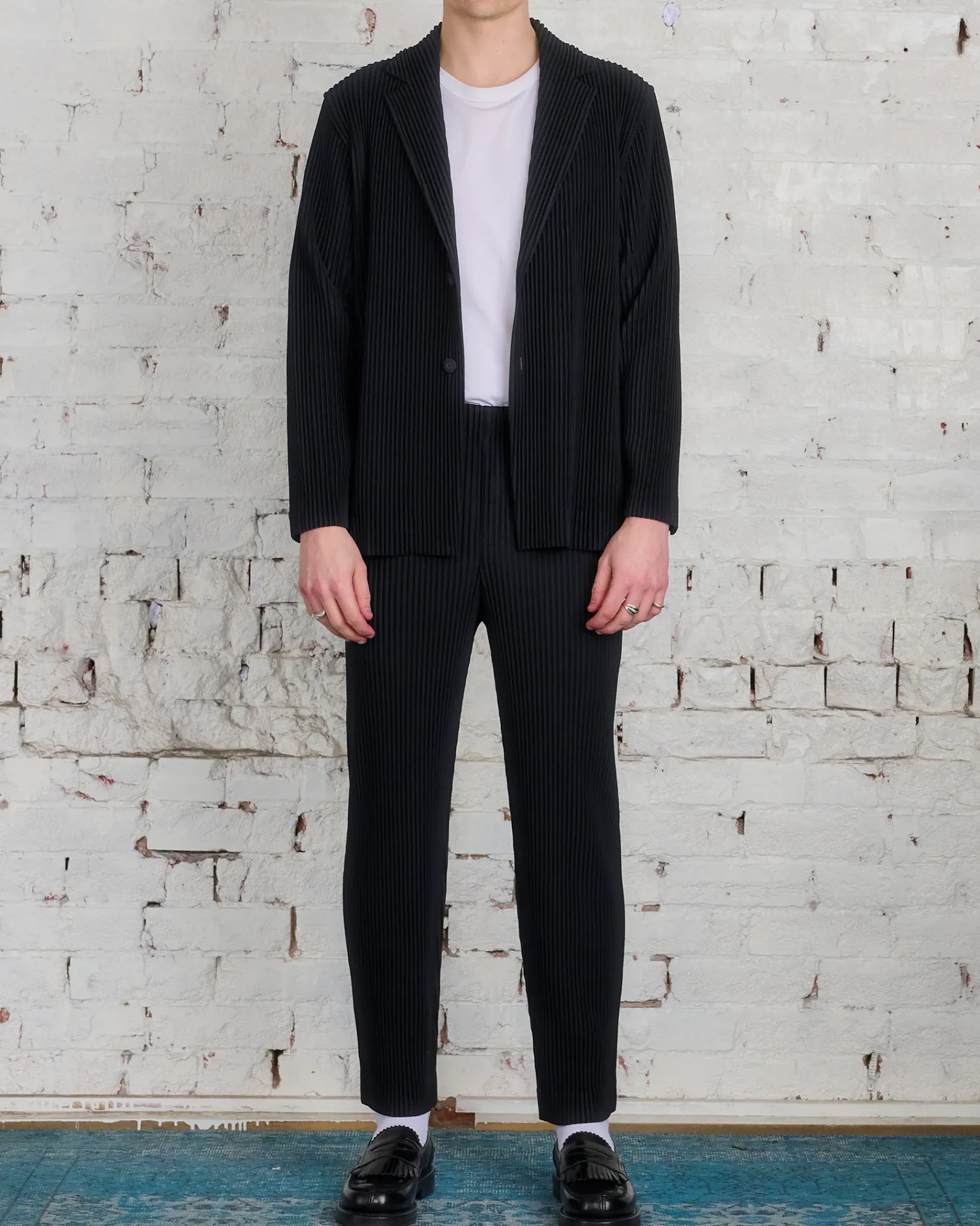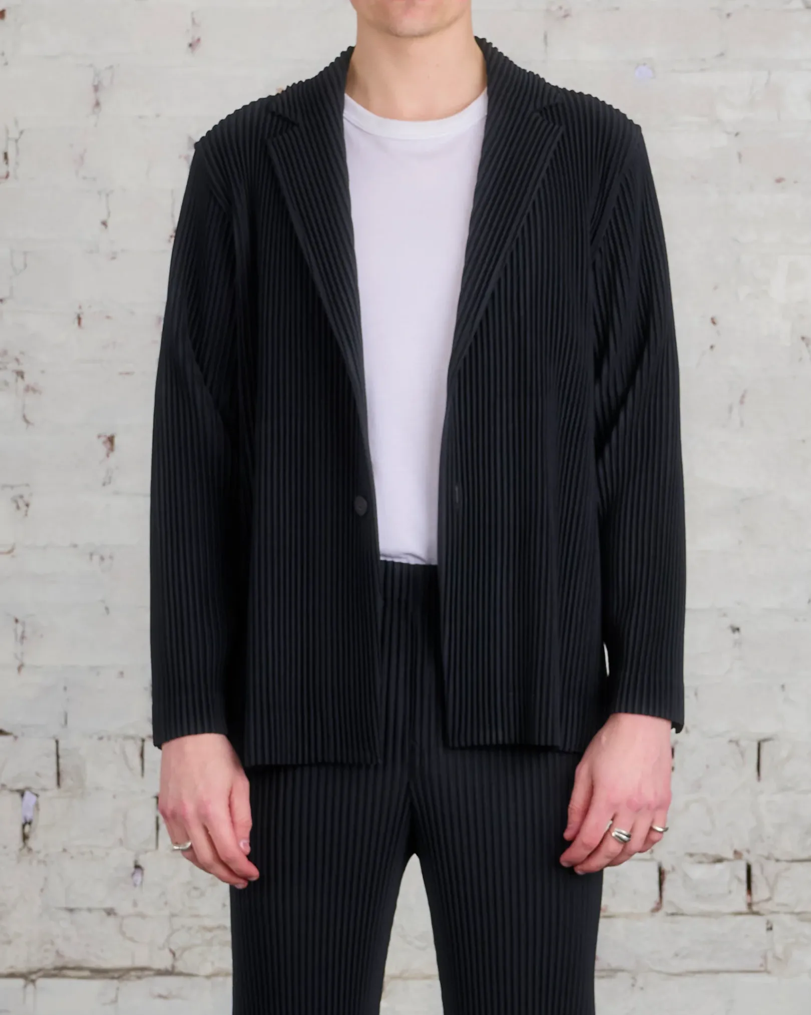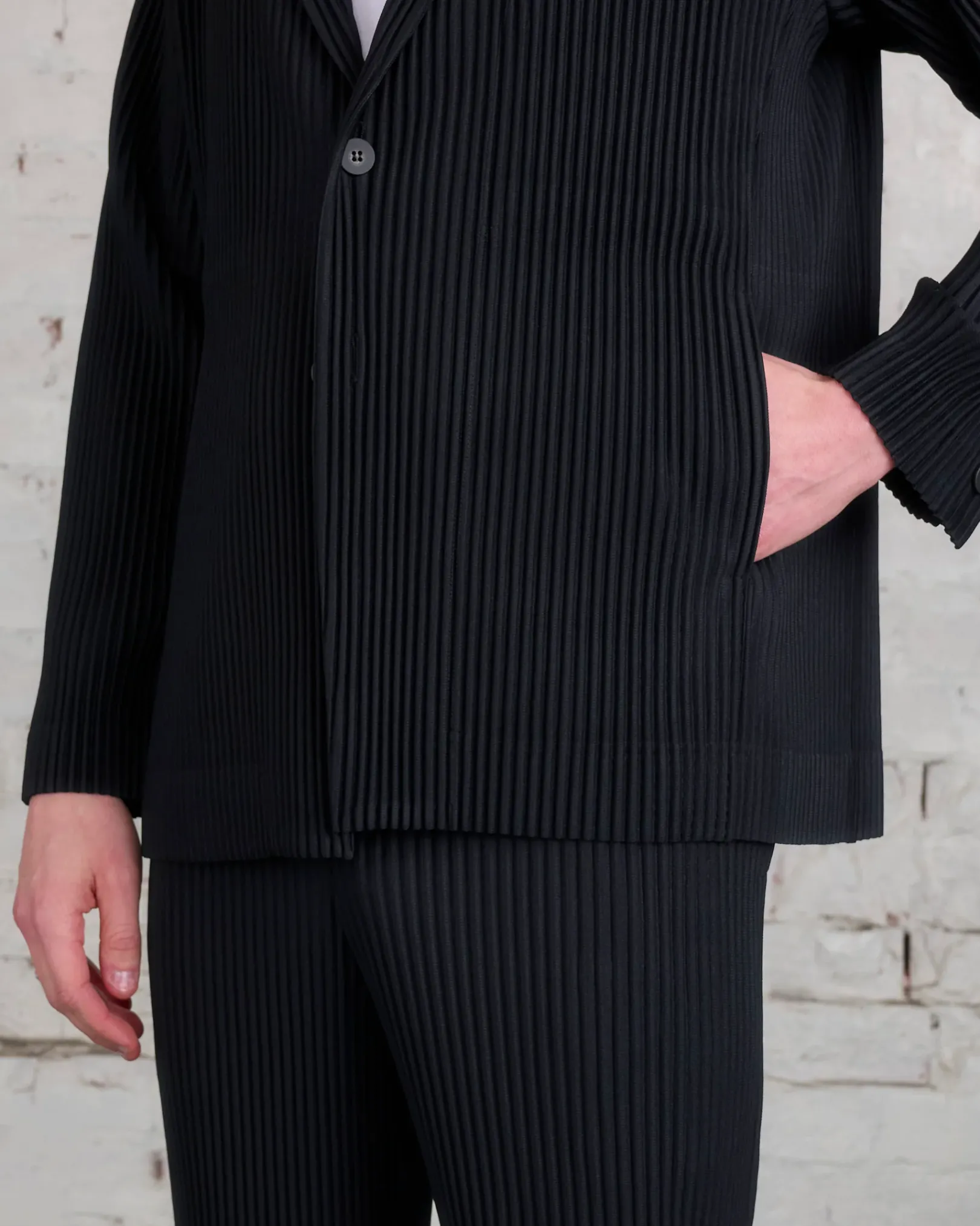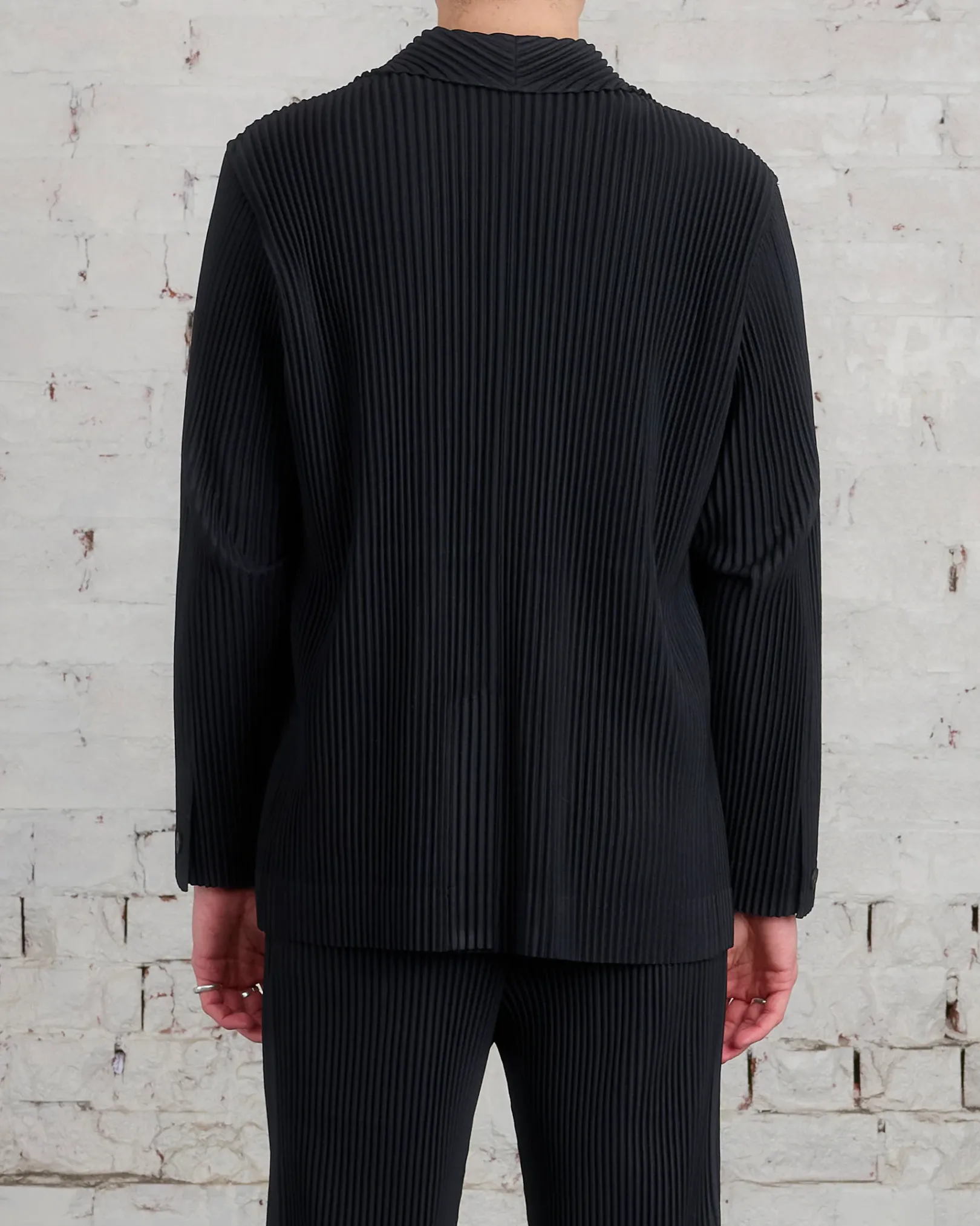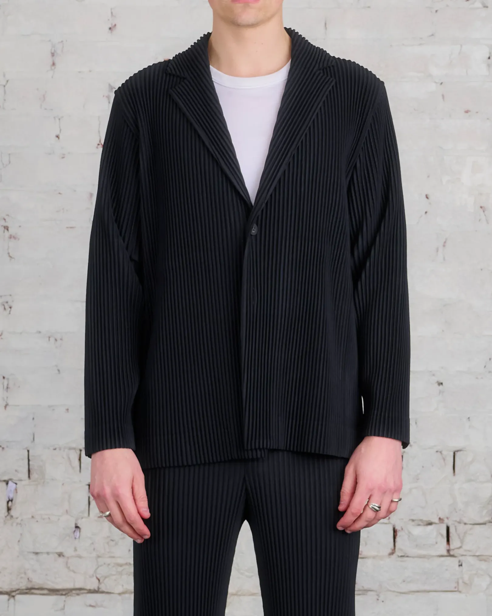 This jacket features a straight fit and tailored shoulder. Two button closure. Two pockets.