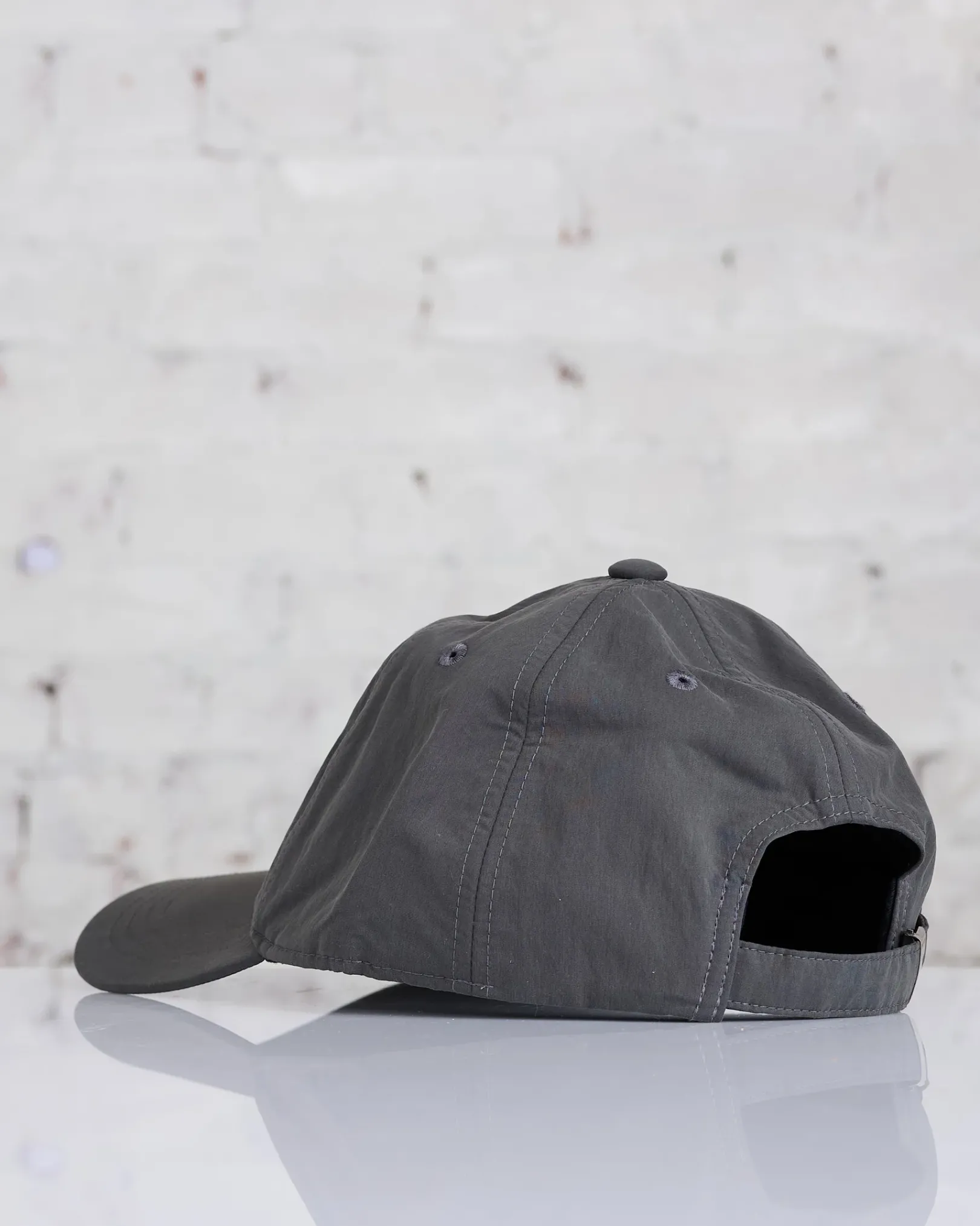 Ballcap in Vapor Charcoal Peached Nylon. Produced in an Italian peached polyamide fabric, the 6 panel baseball cap has a curved brim, stitched eyelets and a rear strap adjuster with brass hardware.