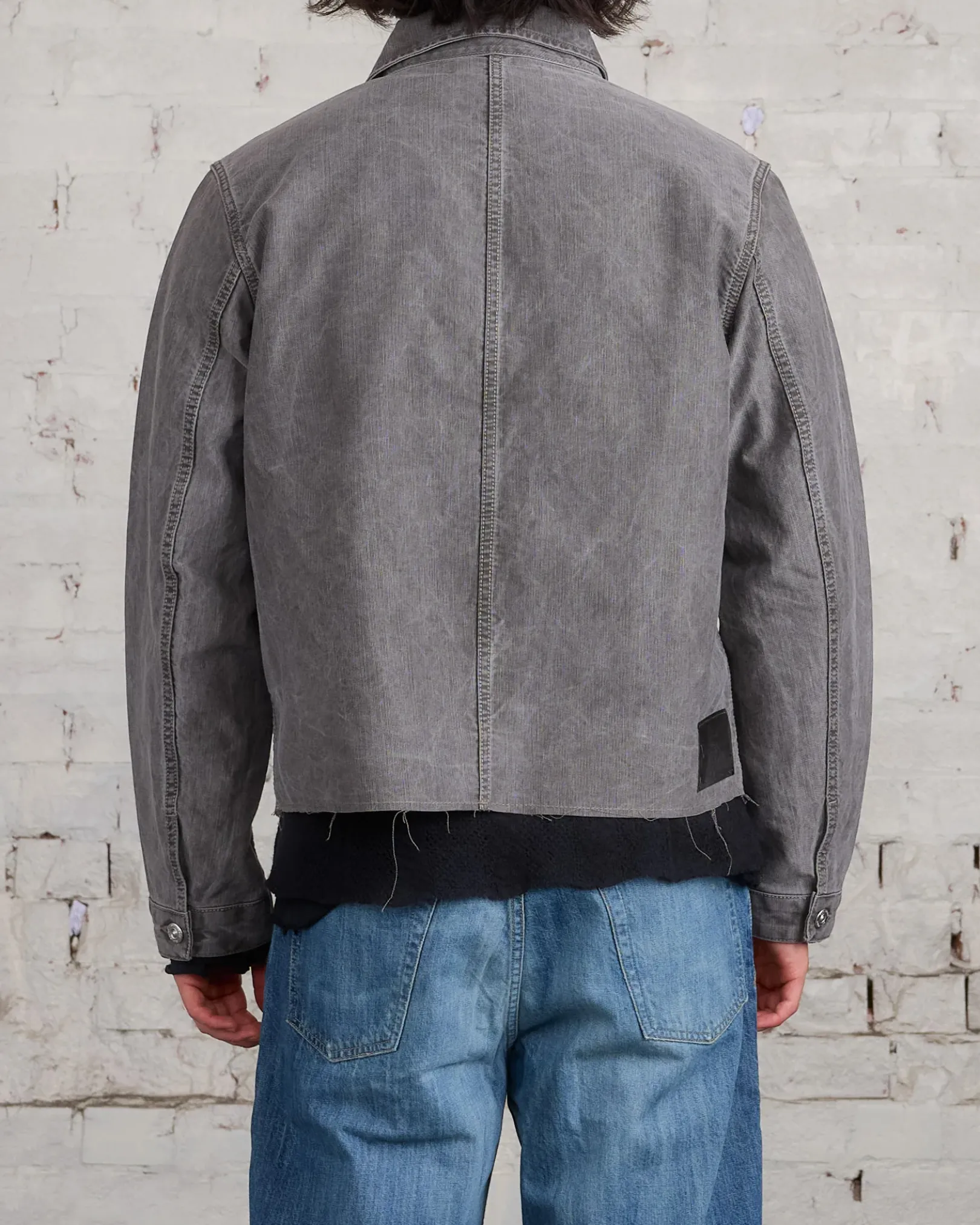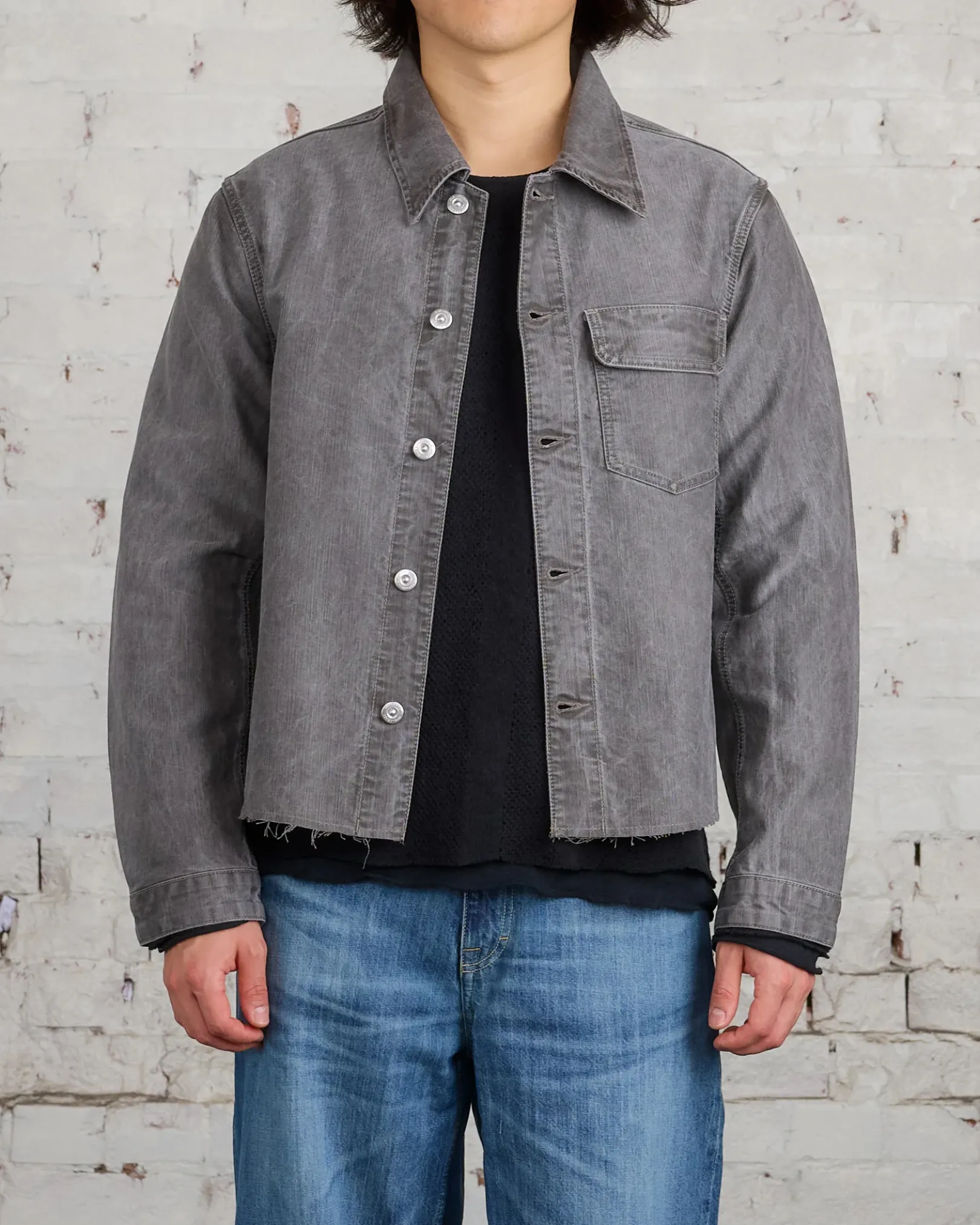 Rebirth Jacket in Olive Pigment Coated Weave. Produced in a bleach washed Italian cotton denim, the mens Cut Rebirth Jacket has a boxy fit and features a single chest pocket with flap closure, metal buttons, an OUR LEGACY embossed patch and a raw edge hem.