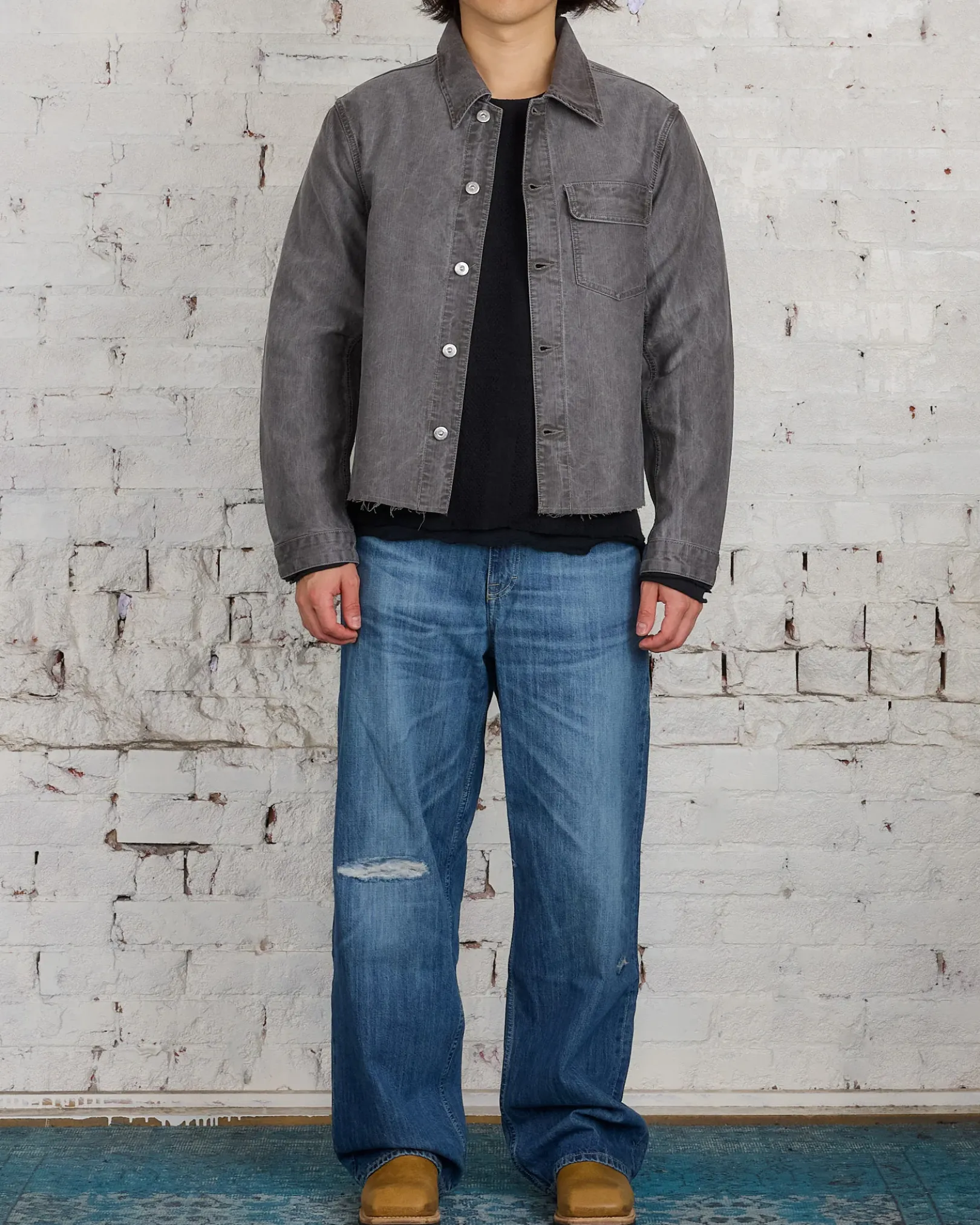This garment is manufactured from carefully sourced denim fabric. Each garment is unique and has been finished with a hand-made bleach process to achieve the desired effect. The garment shall be shaped by its wearer and naturally distress over time to finish the design process.