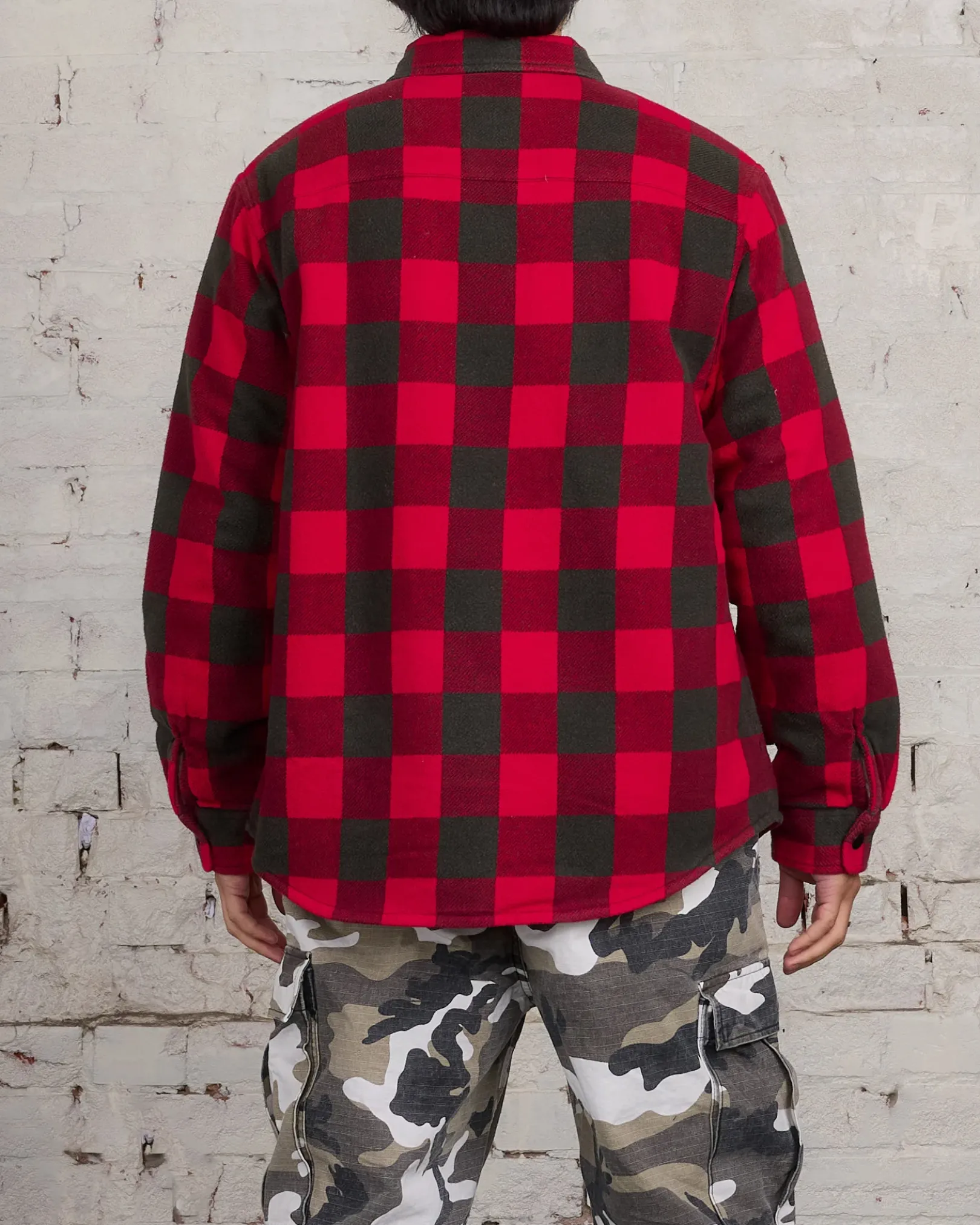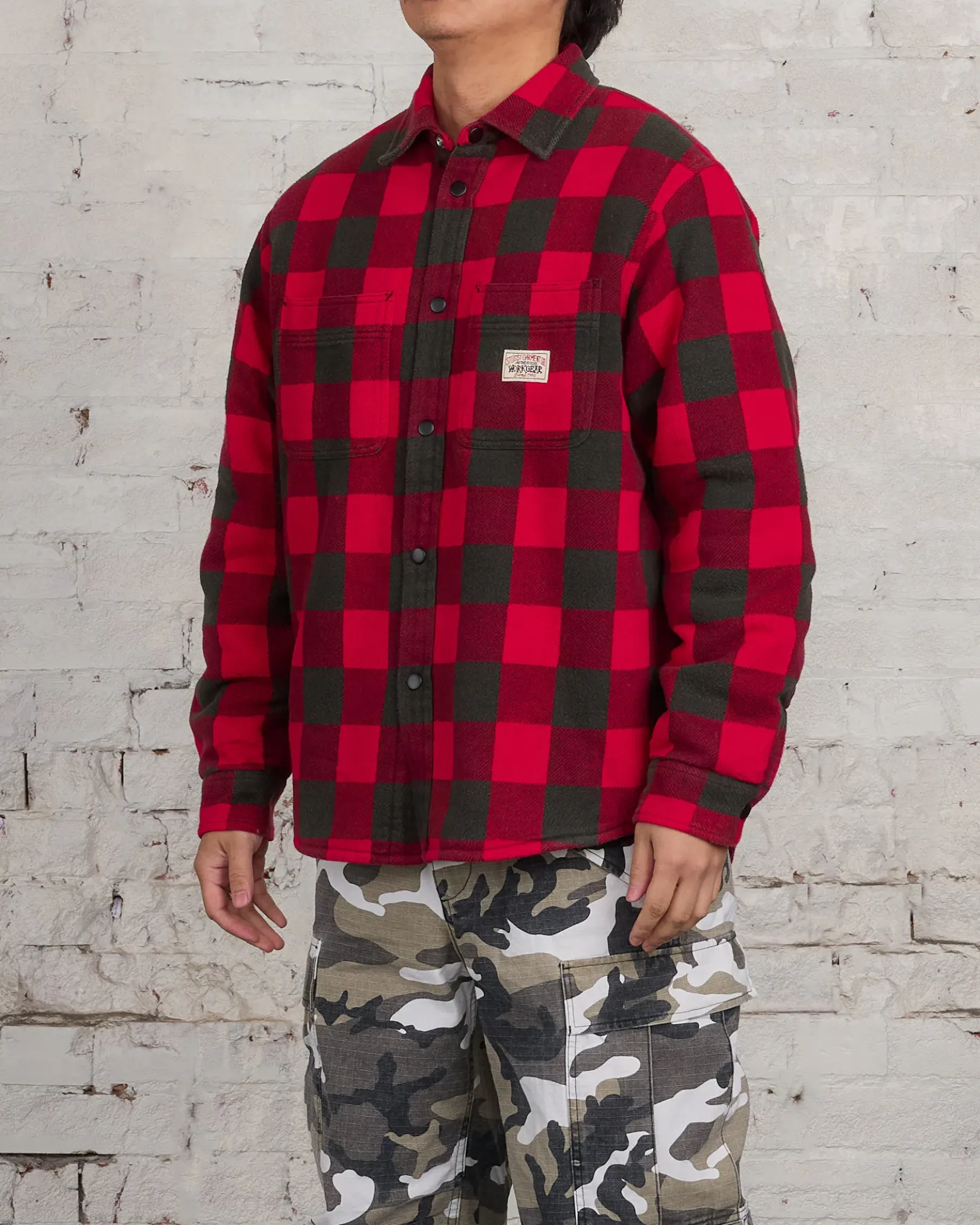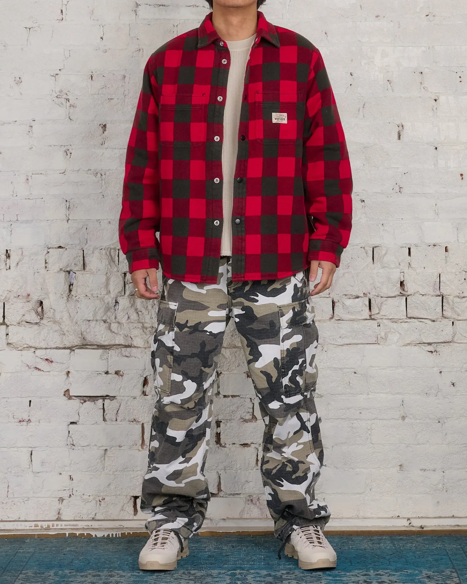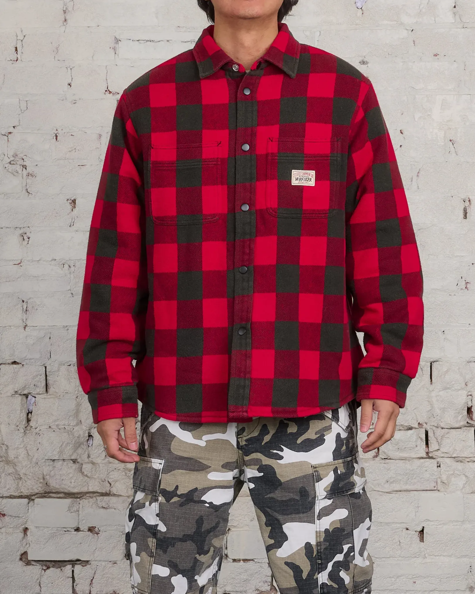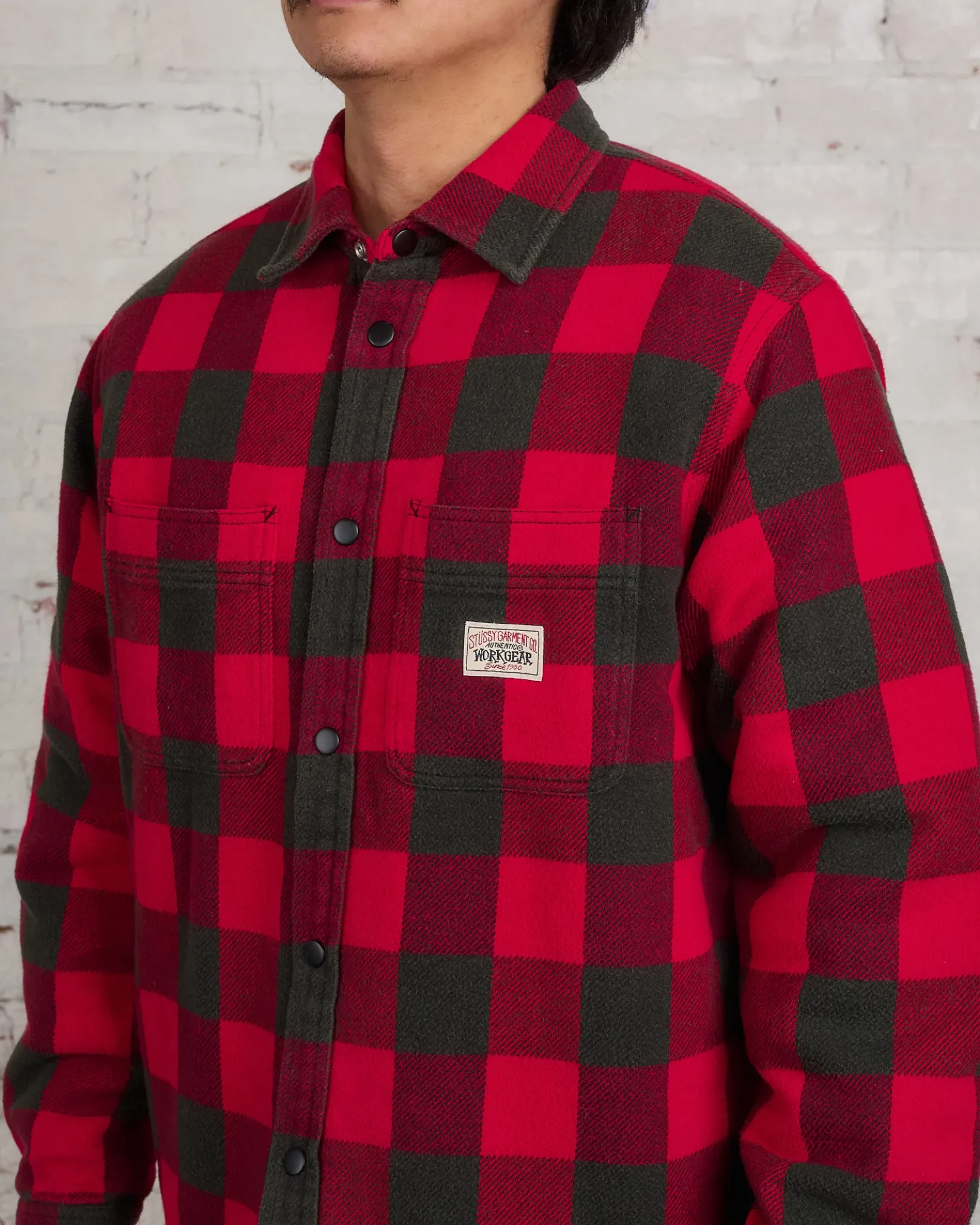 Relaxed fit cotton shirt with a sherpa-lined body and satin quilting in the sleeves. Features patch pockets, front snap closure and topstitching along the seams. Stüssy workgear label stitched at the left pocket.