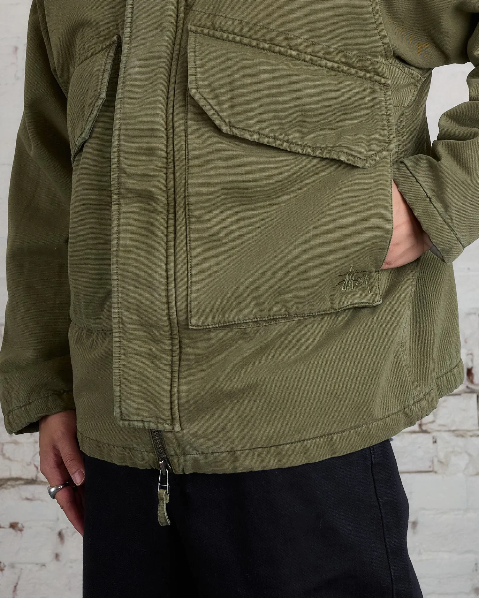 Relaxed fit field jacket in cotton canvas. Features lightweight insulation, front patch pockets and zipped interior pockets. Stüssy basic stock logo embroidered at the left chest.