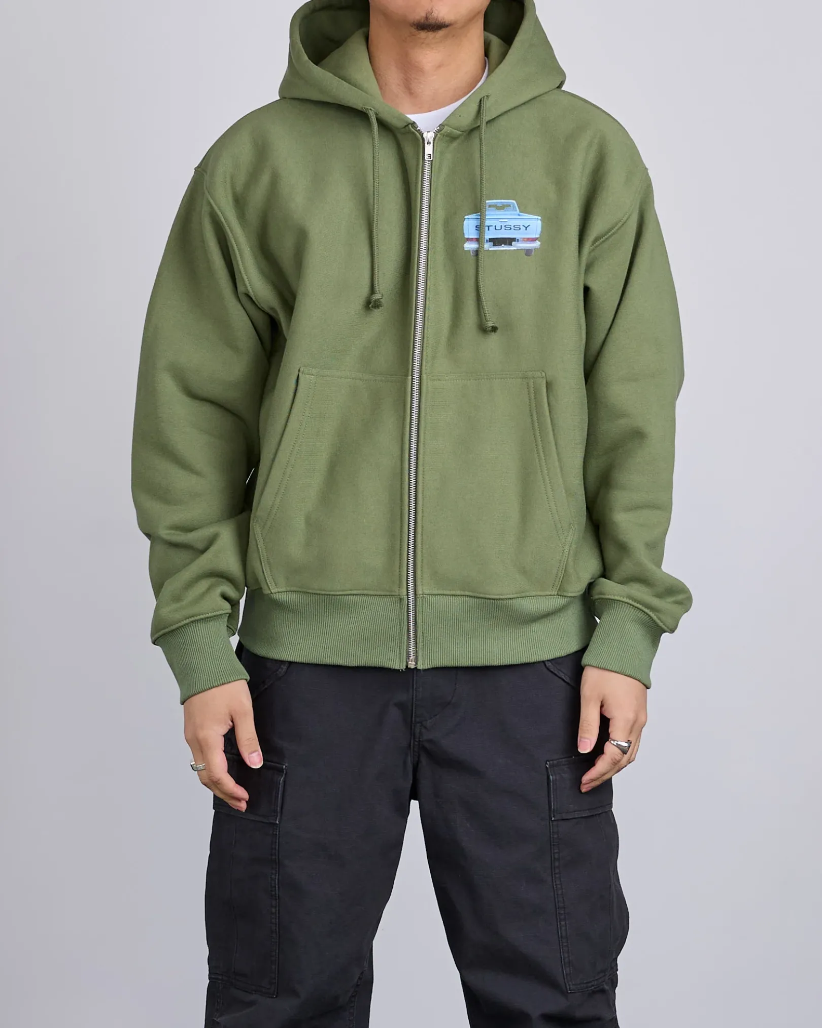 Relaxed fit zip-front fleece hoodie in a heavyweight 430gsm cotton blend. Screenprinted graphics at left chest and across back.